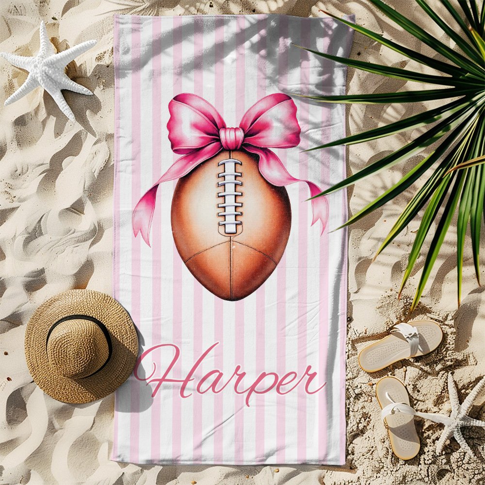 The personalized pink striped beach towel with a Coquette bow ball design will make your beach trip unique. You can choose your favorite ball pattern from softball, baseball, soccer, basketball, and football. Its sporty and girly style will form a unique combination. It can be customized with your name so you can stand out from the crowd and enjoy the passion of summer.