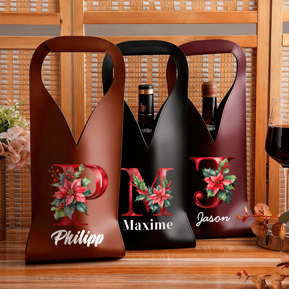 You can choose a color from options like Red, Wine Red, Black, Brown, and Light Brown. Select an initial from A-Z and input a name. The design features a floral motif (poinsettia and holly leaves) that adds a festive touch, making each tote a unique accessory that reflects your style or the recipient’s personality.