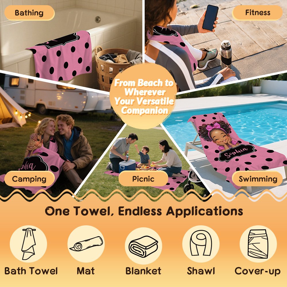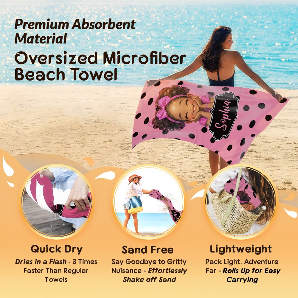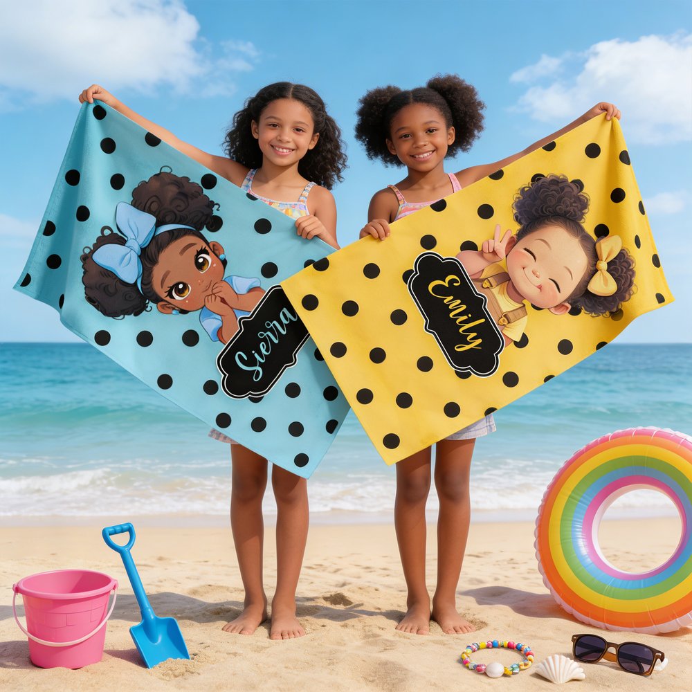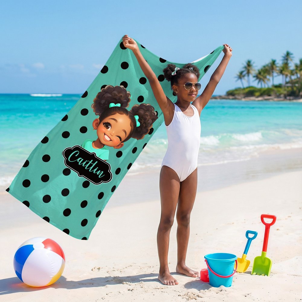 This beach towel features a polka dot base with an adorable cartoon character of an African American girl. Details such as curly hair and a bow add a touch of childlike fun and make it easily recognizable. You can choose your favorite cartoon little girl character and customize it with your child's name, making the beach towel a unique and personalized accessory that reflects her individuality.