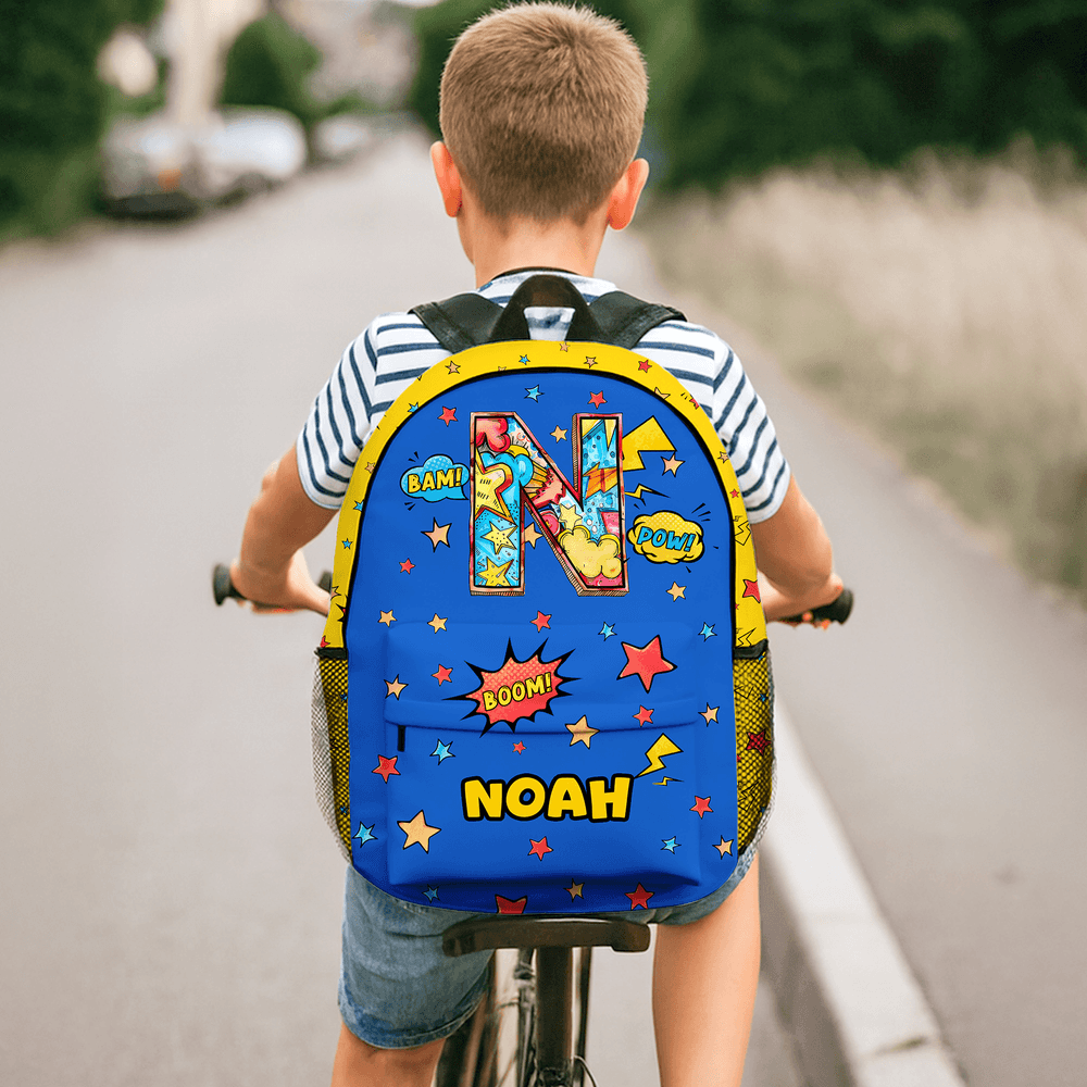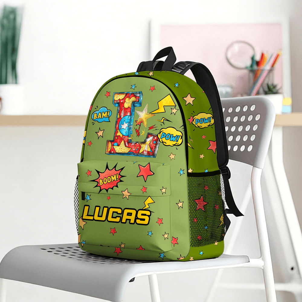 Featuring a bright, cartoon-style design with fun elements like stars and exploding frames, this backpack offers vibrant initials and personalized name customization, along with 14 color combinations to choose from. It allows children to express their unique personalities and easily stand out at school.