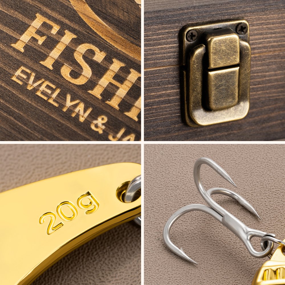 Our wooden box and hook set is specially designed for fishing enthusiasts, blending elements like fishing rods, fish, and antlers to showcase a unique aesthetic taste. With exquisite patterns and realistic fishing lures, along with customizable names, initials, and texts, each piece gains a unique identity that makes every angler feel connected.