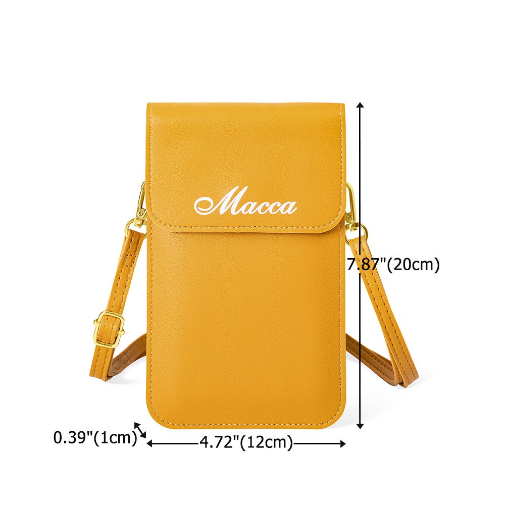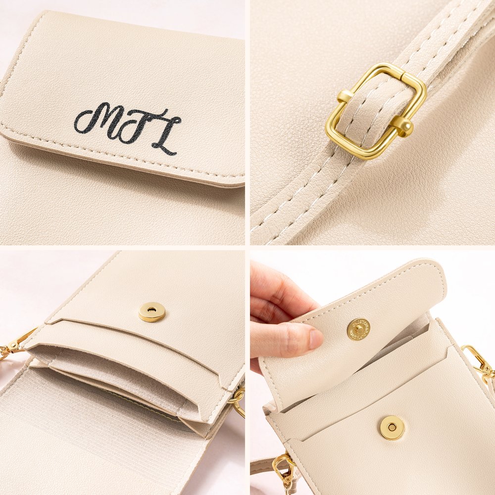 This crossbody bag combines wallet, phone bag, and crossbody bag functions into one, with a highly ingenious design. The PU leather surface of the bag presents a delicate texture. The front can be customized with a name, and the font is simple and elegant, giving the bag the "exclusive identification" attribute.
