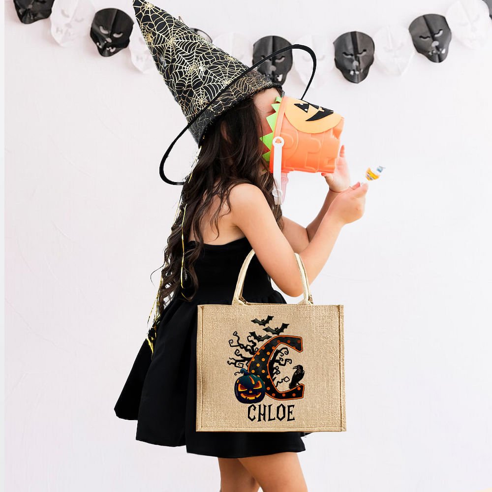 Our tote bag uses Halloween-related patterns, such as a pumpkin lamp, black cat, bat, spider web, etc., to create a solid festive atmosphere, and the design of the tote bag with personal names and letters makes it more unique.