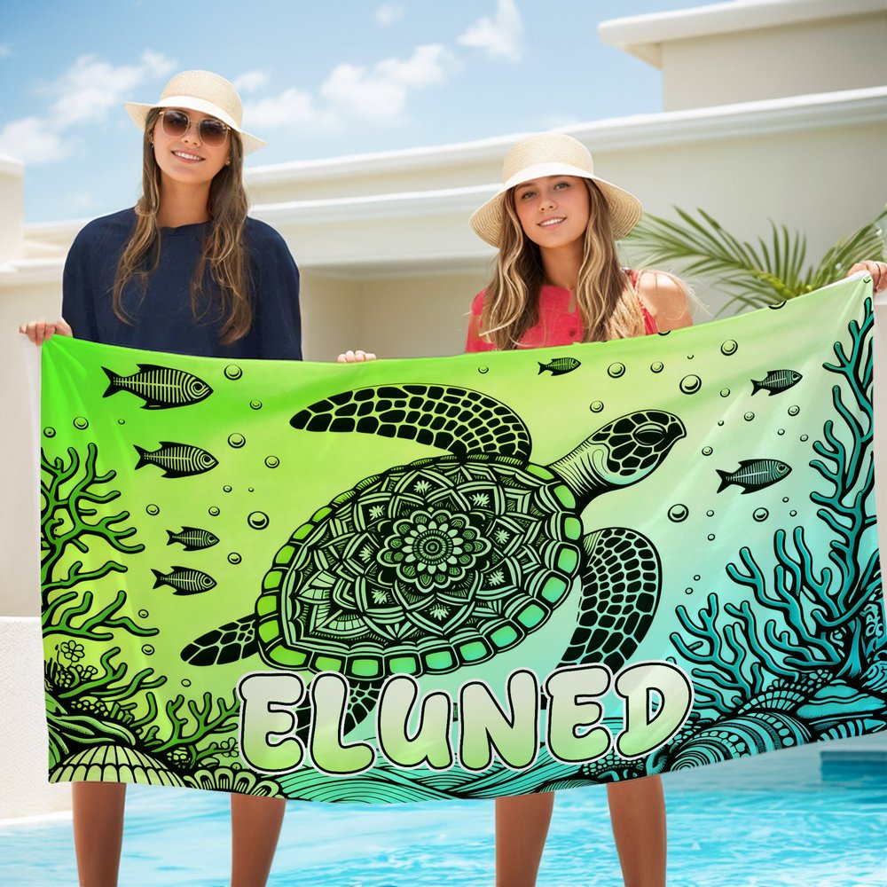 The classic retro turtle design paired with highly saturated colors makes this beach towel stand out in the sunlight, combining practicality with a decorative touch. Personalization is available, making each towel unique and adding a sentimental value.