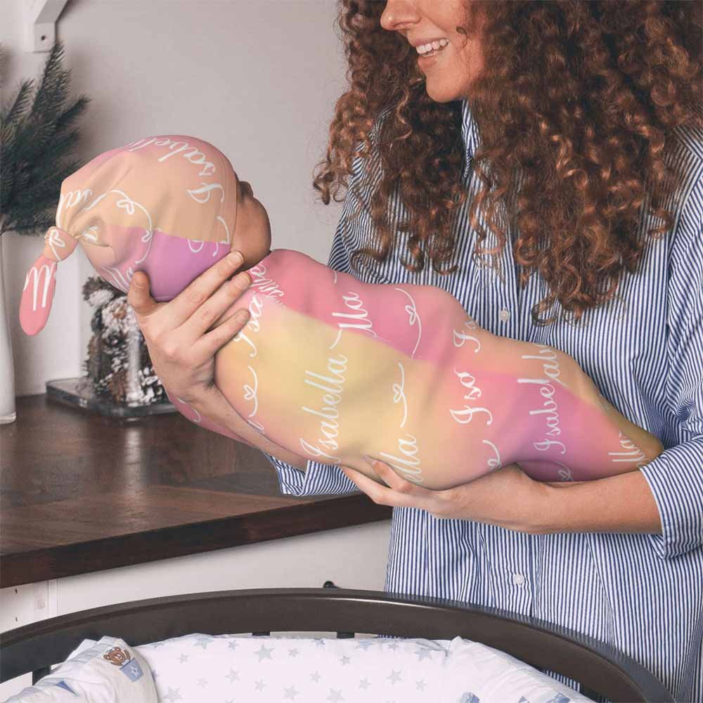 This personalized baby blanket is made of high-quality cotton, so it is very soft and warm and skin-friendly. It includes a swaddle blanket and a hat with an adjustable knot on the top. Our top-knotted baby beanie hats and headbands are designed with the baby’s comfort in mind.