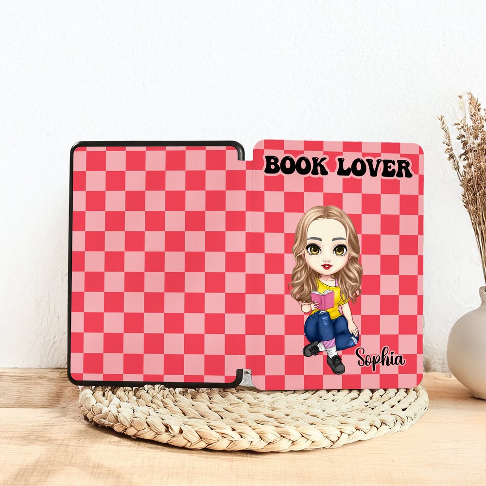 This Kindle cover features a checkerboard pattern as the base, cleverly combining colorful cartoon characters to satisfy diverse aesthetic preferences. Each character holds a book, adding a lively touch, while the phrase "BOOK LOVER" printed above showcases a passion for reading. Below, there's an option for a customized name, making each cover one-of-a-kind and a perfect expression of personal style.