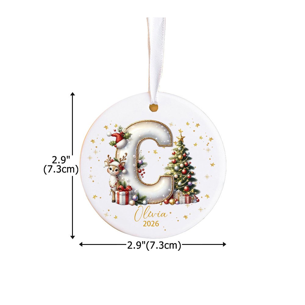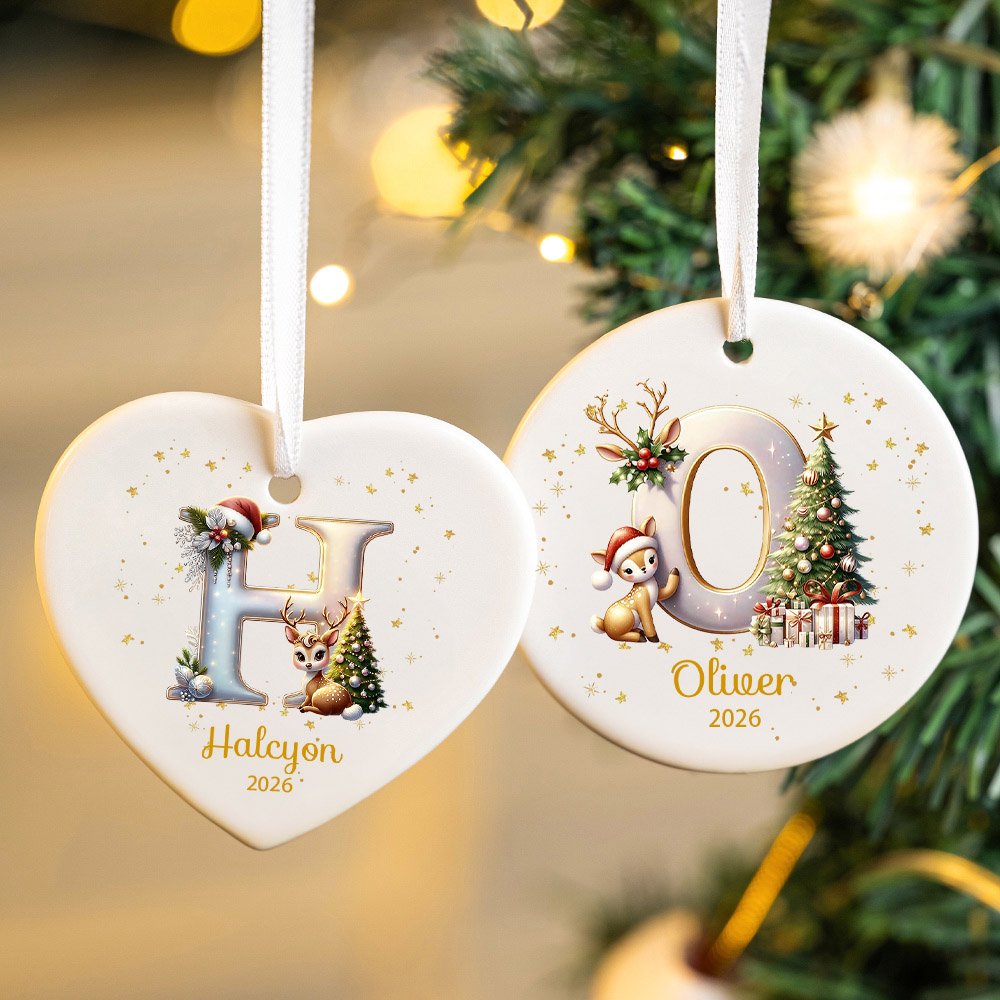 This beautifully crafted ceramic ornament features the festive Christmas initial adorned with cute reindeer and a Christmas tree, you can customize it with your name and year, making this ornament a meaningful representation of the holiday season.