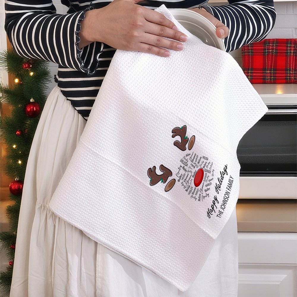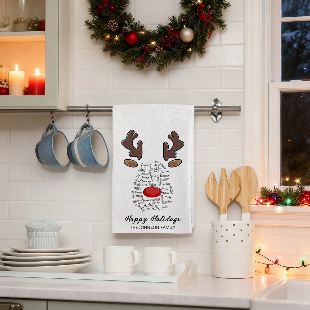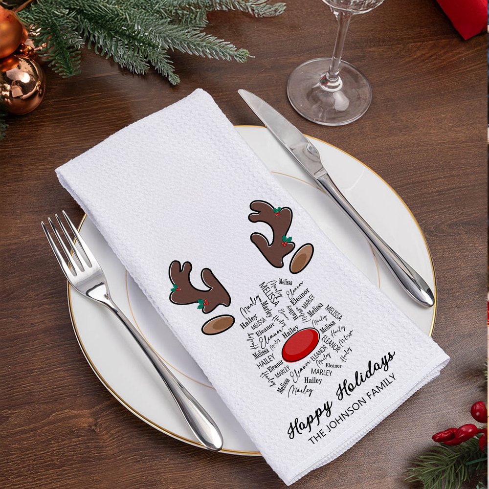 This tea towel features a delightful reindeer pattern inspired by the joyful spirit of Christmas, with every detail exuding the magic of the holiday season. The personalized name and text design not only make the towel unique but also add a special family touch, making it a standout piece in your kitchen decor.