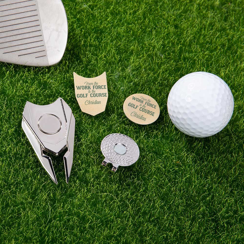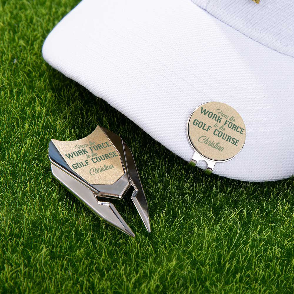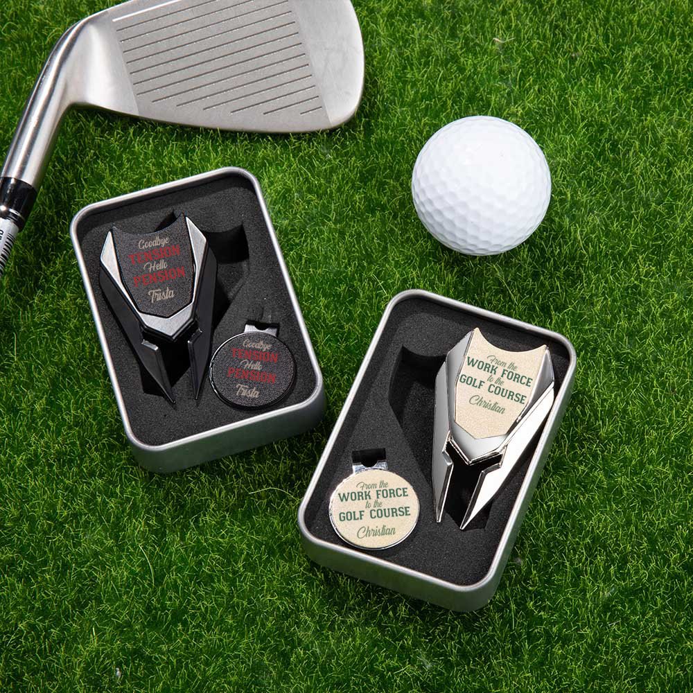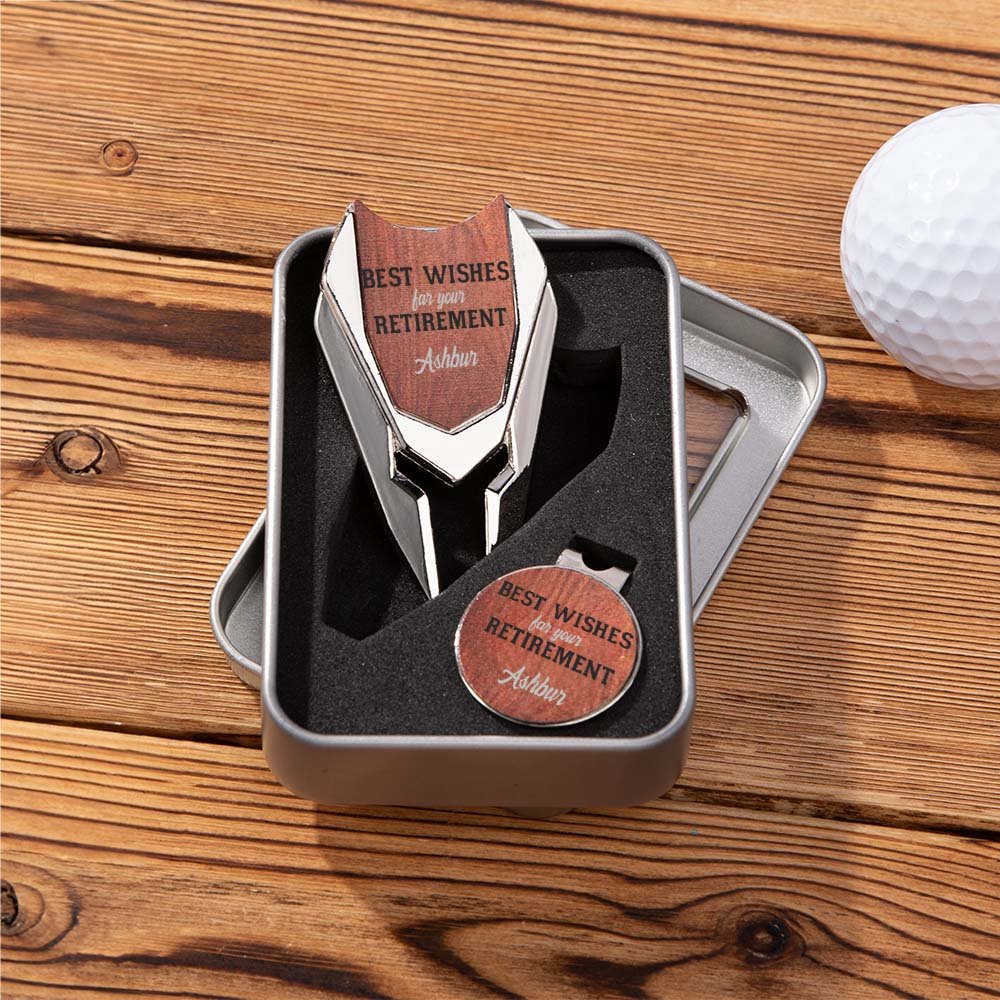 Personalize this retirement golf set with the retiree's name to make it even more special. This set features a divot repair tool and a magnetic hat clip, which meets your golf needs.