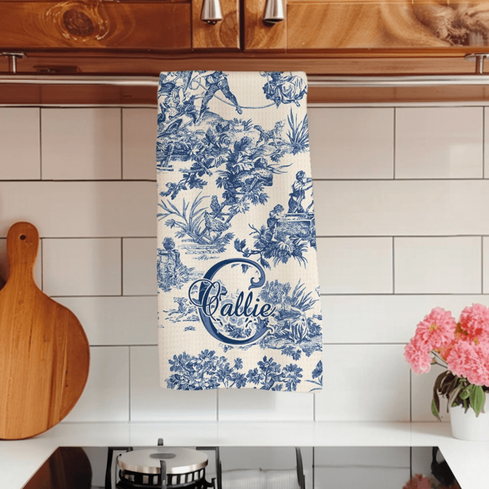 Personalized Retro French Toile De Jouy Waffle Tea Towel with Initial and Name Kitchen Decor Wedding Engagement Gift for Newlyweds Couple