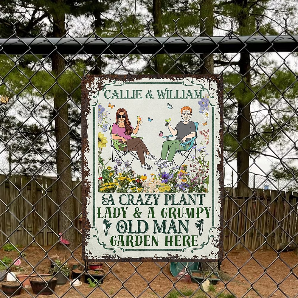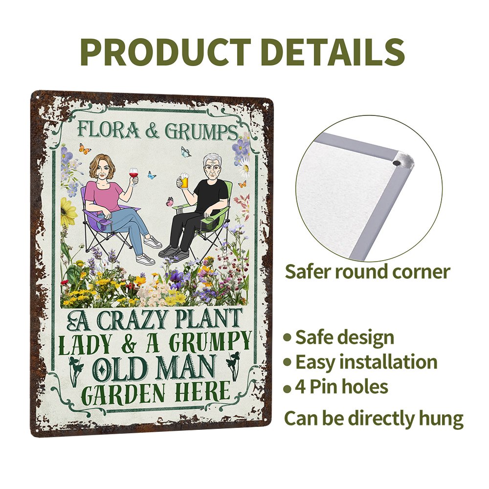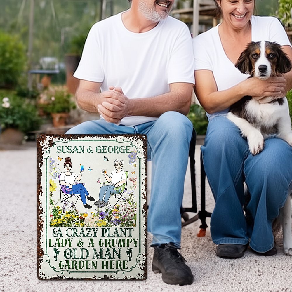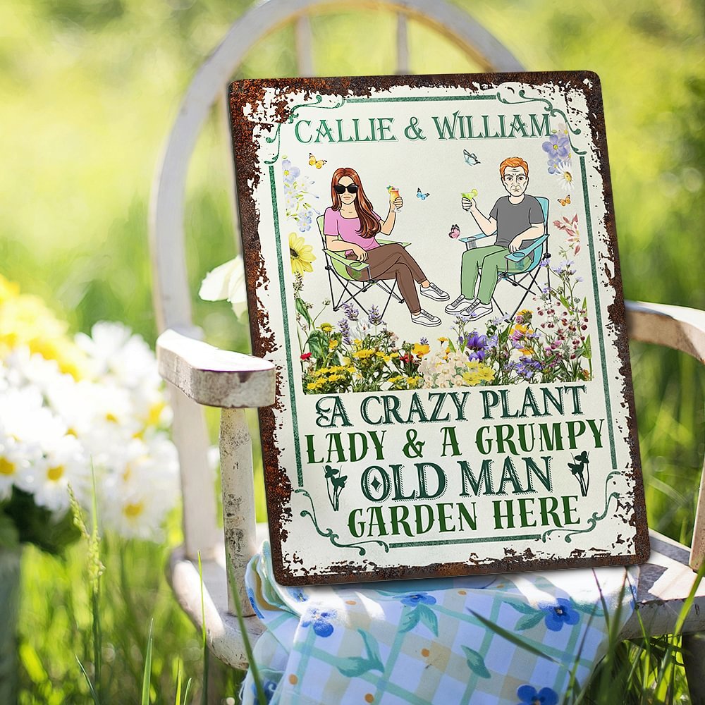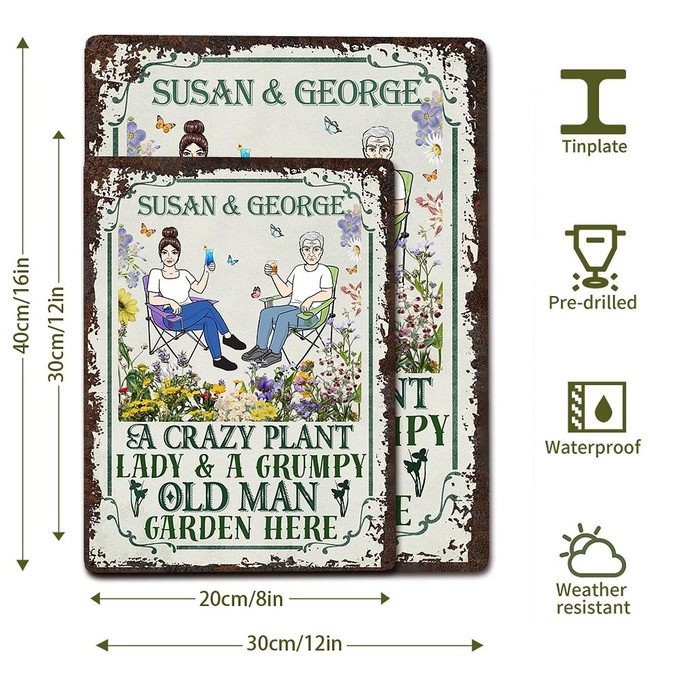 This metal sign features two cartoon characters sitting on a folding chair with a relaxed expression, surrounded by blooming flowers and fluttering butterflies. The bottom of the plate also has “A Crazy Plant Lady & a Grumpy Old Man” and “Garden Here,” which is full of the mood of life. What's more, it supports customized names and cartoon shapes, making each sign unique.
