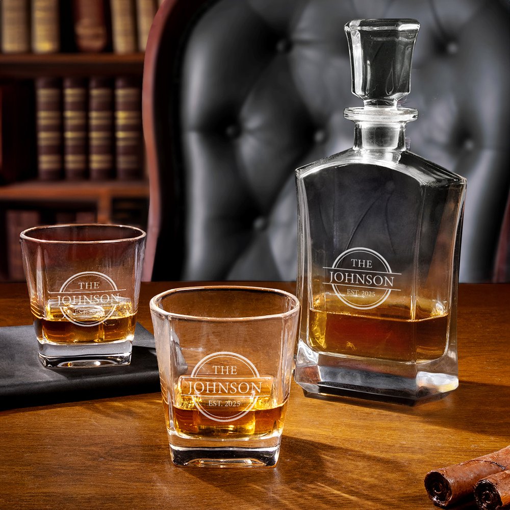 This whisky decanter set features a vintage border and retro wreath design, making it more refined and aesthetically pleasing than traditional solid-color glass. You can laser-engrave personalized content, including your name, initials, text, and date, on the decanter bottle, glasses, and wooden box. Multiple combinations are available to suit your individual preferences and highlight your elegant style.