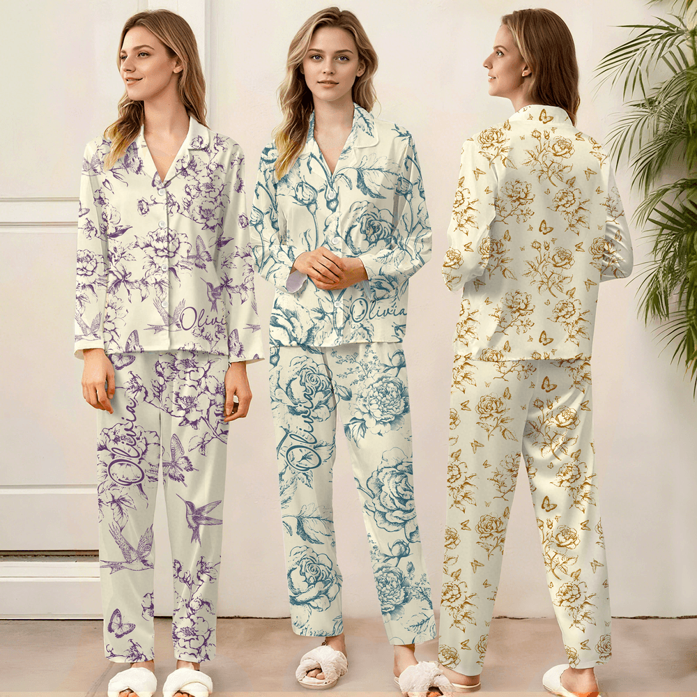This pajama set draws inspiration from the beauty of nature, featuring vibrant floral patterns that bring the essence of spring into your bedroom. Every detail has been thoughtfully designed to highlight the elegance of women while adding warmth and a sense of intimacy. You can customize the patterns and add your name, making this pajama set a unique expression of your personal style.
