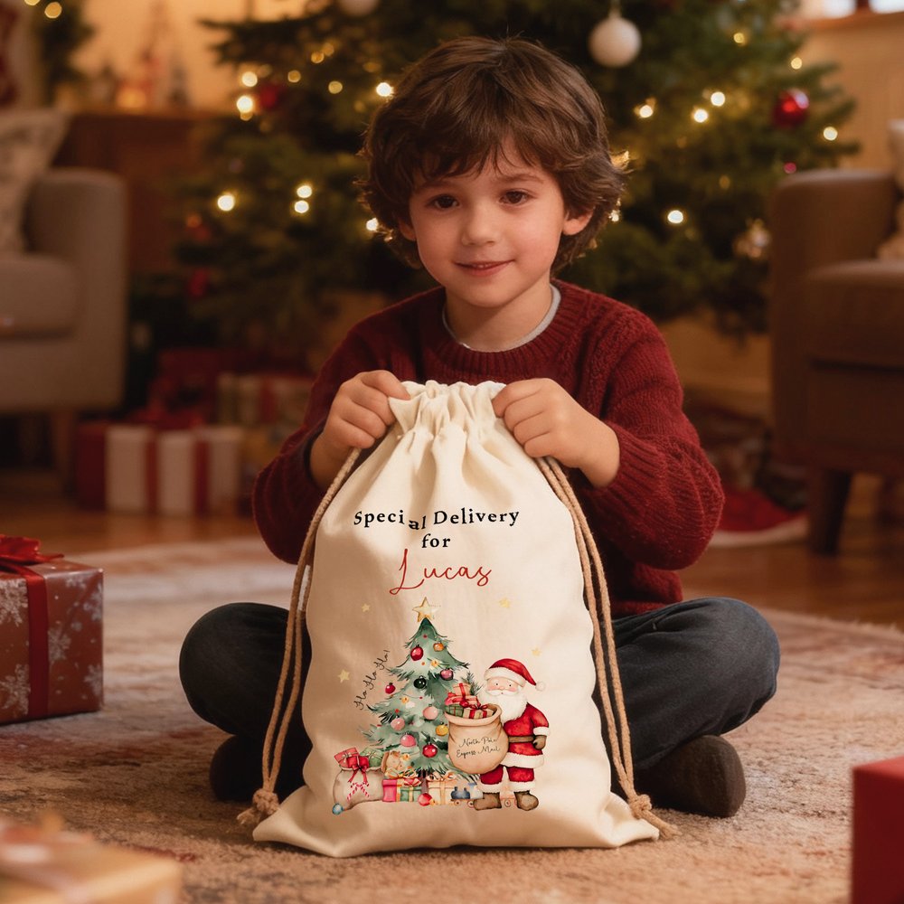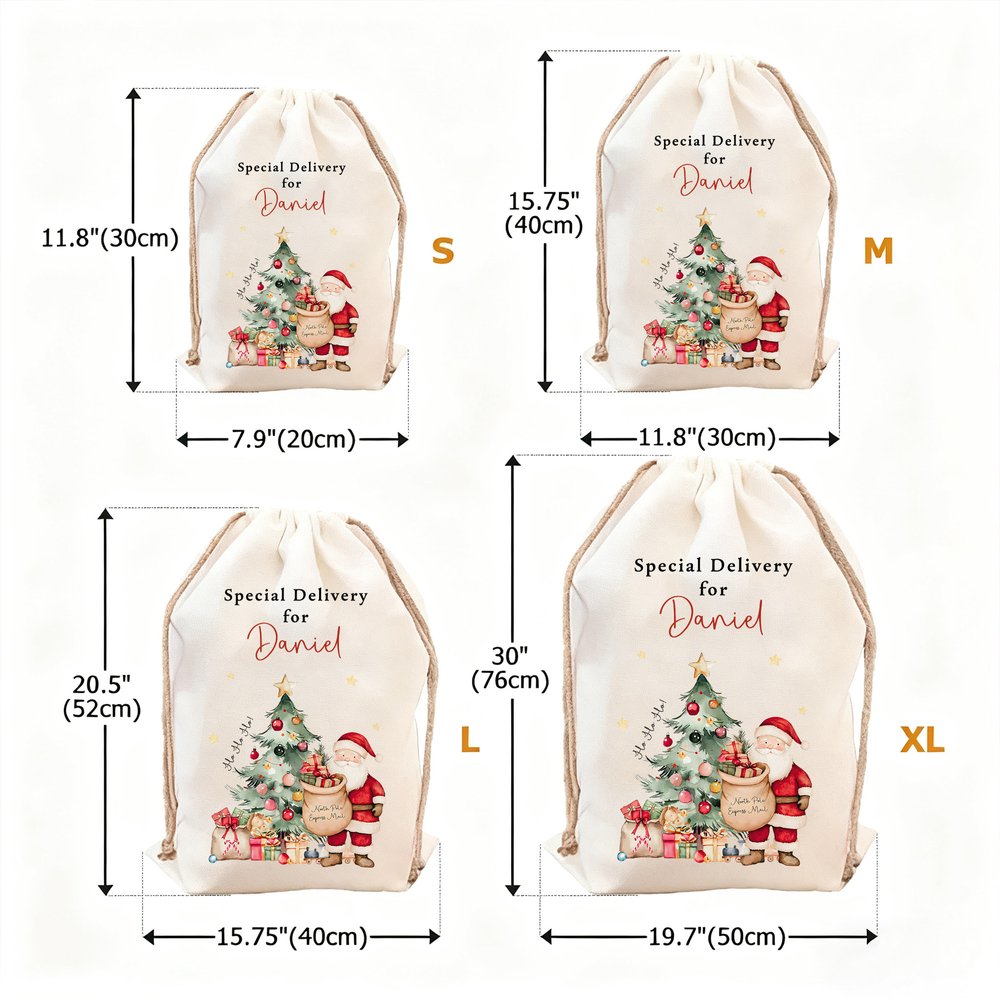 Personalized Santa Claus Christmas Tree Large Canvas Drawstring Gift Bag with Title and Name Christmas Gift for Family Friends
