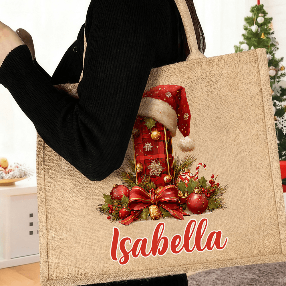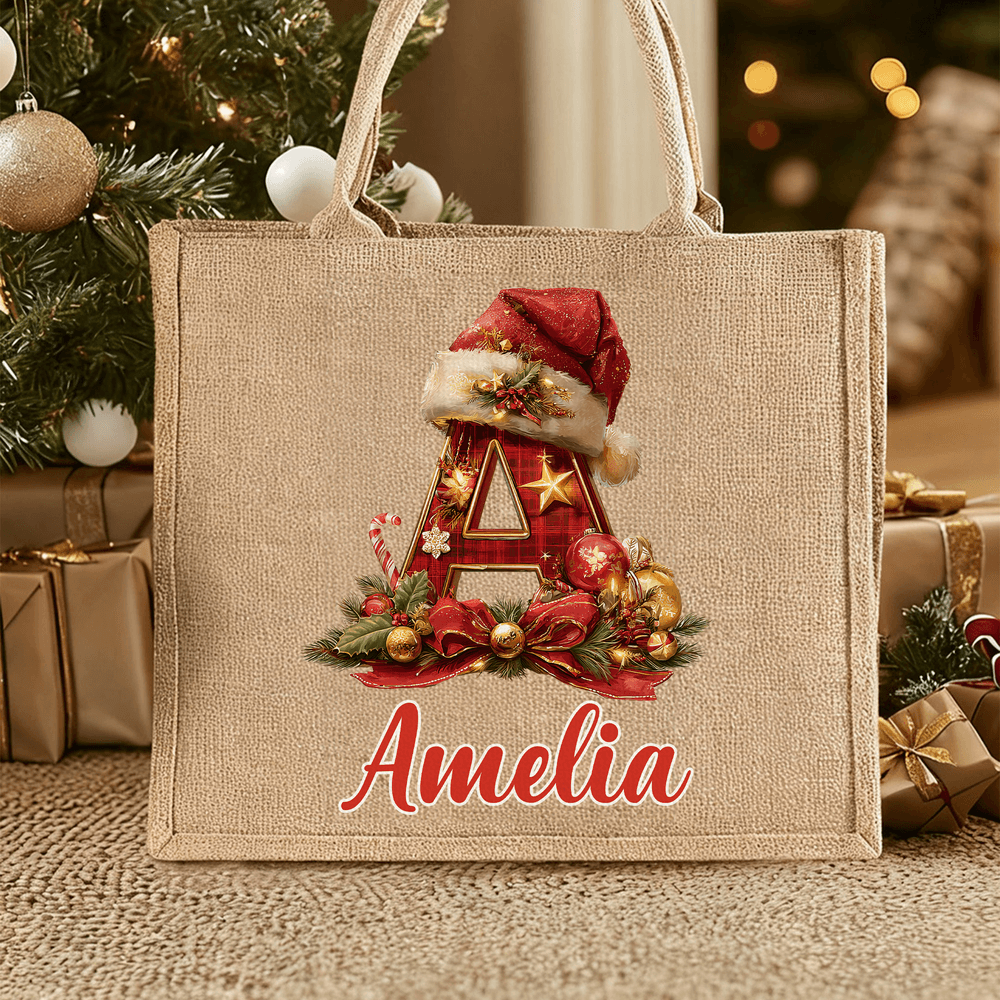 Highlighted with Christmas-themed initials, this tote can be customized with any name. Available in rich red and jute tones, the striking style captures the essence of the holidays while adding a personal touch.