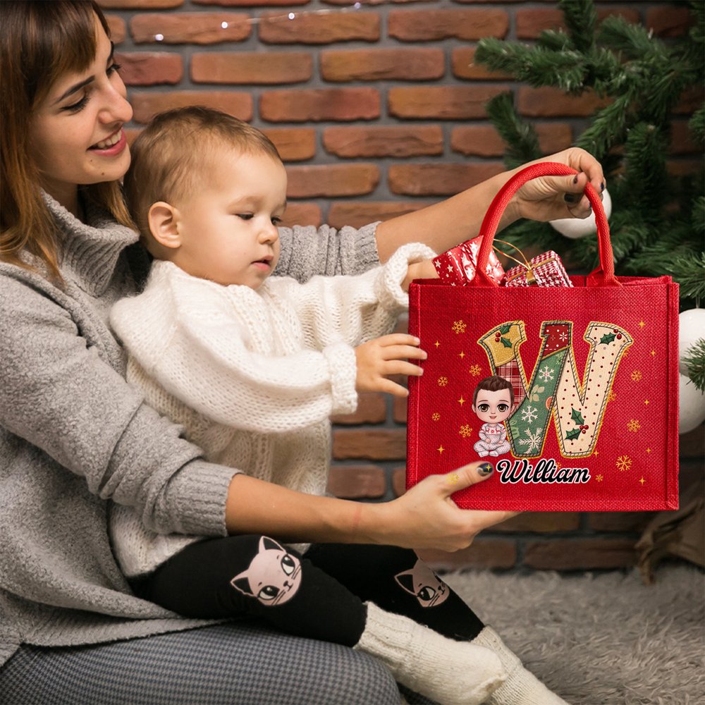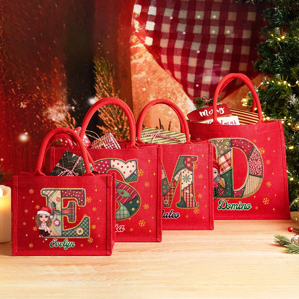 This tote bag features a vibrant red color as its primary tone, with a lively and adorable cartoon character donning a Santa hat, infusing the bag with energy and fun. The design centers around a prominent initial, with the letter's surface adorned with a variety of colorful Christmas-themed patterns, perfectly reflecting the warmth and joy of the holiday season. Additionally, the customization option for names makes each bag a unique creation, imbued with special emotional significance.