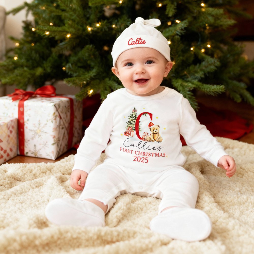 This adorable baby set features a joyful Christmas theme, cleverly incorporating elements of teddy bears, Christmas trees, and gifts. The background is adorned with stars, adding a touch of childlike fun and creating a warm holiday atmosphere that will capture the hearts of both children and parents. The eye-catching "FIRST CHRISTMAS" logo, paired with a personalized name and year, is perfect for commemorating your baby's first Christmas.