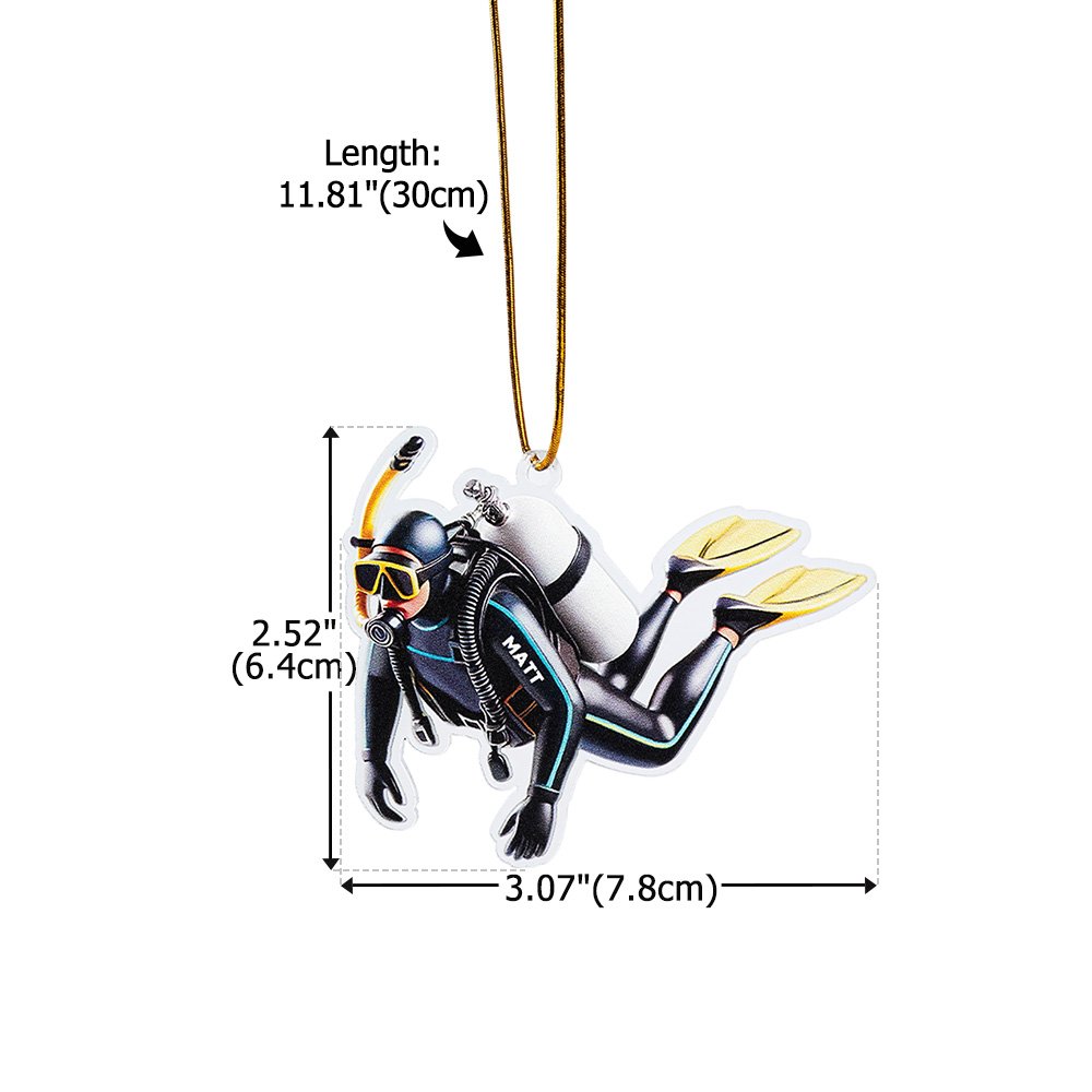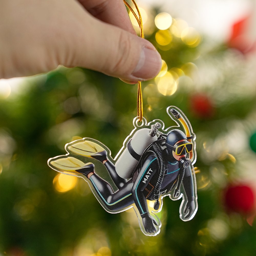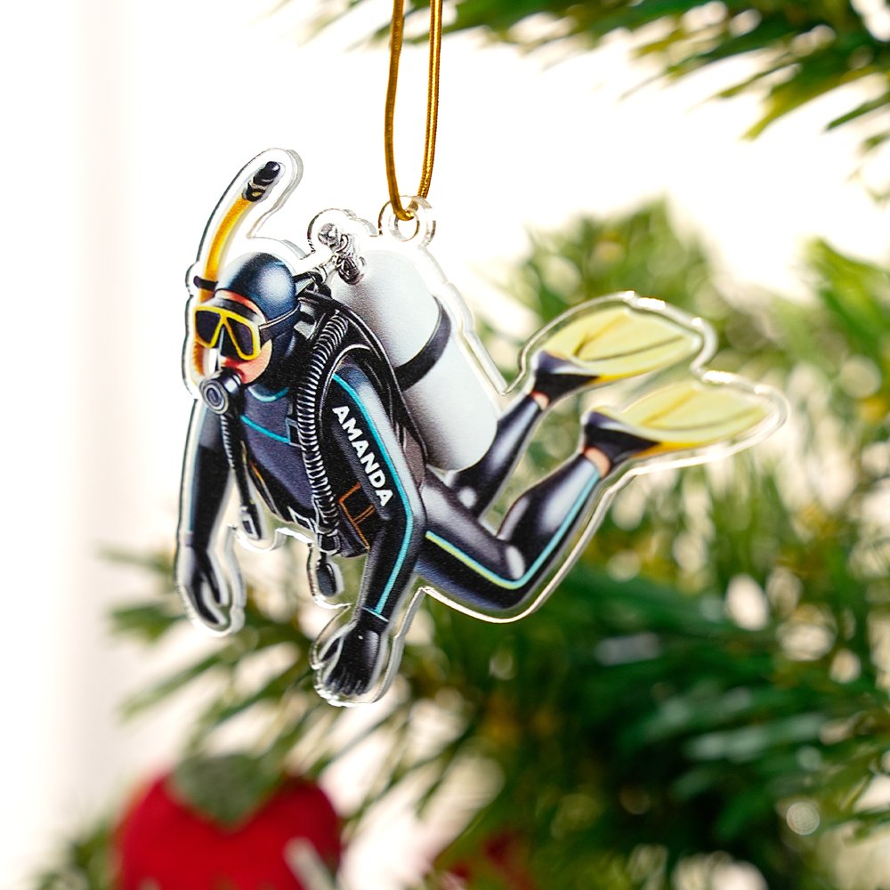 This ornament features a realistic diver design, celebrating the allure of underwater exploration. Customizable with a name for added personalization, it conveys a love of deep-sea exploration, becoming a sentimental reminder for divers and ocean enthusiasts, capturing special ocean memories.