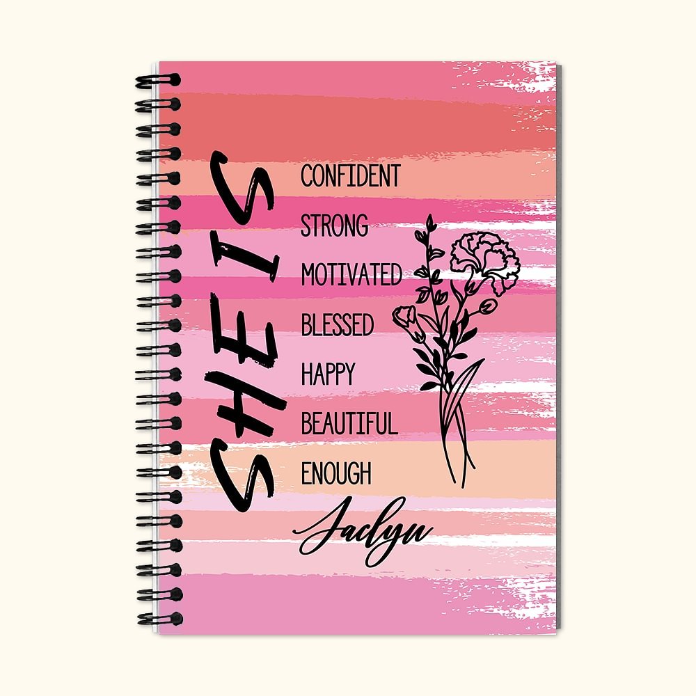 The cover features the bold statement "She is confident/strong/motivated/blessed/happy/beautiful/enough," designed to uplift and inspire. Each word is a daily affirmation, encouraging women to embrace self-love and empowerment, making it ideal for anyone seeking encouragement. You can personalize the owner's name and a delicate birth flower on the cover to add a personal touch that enhances the sense of empowerment and self-care.