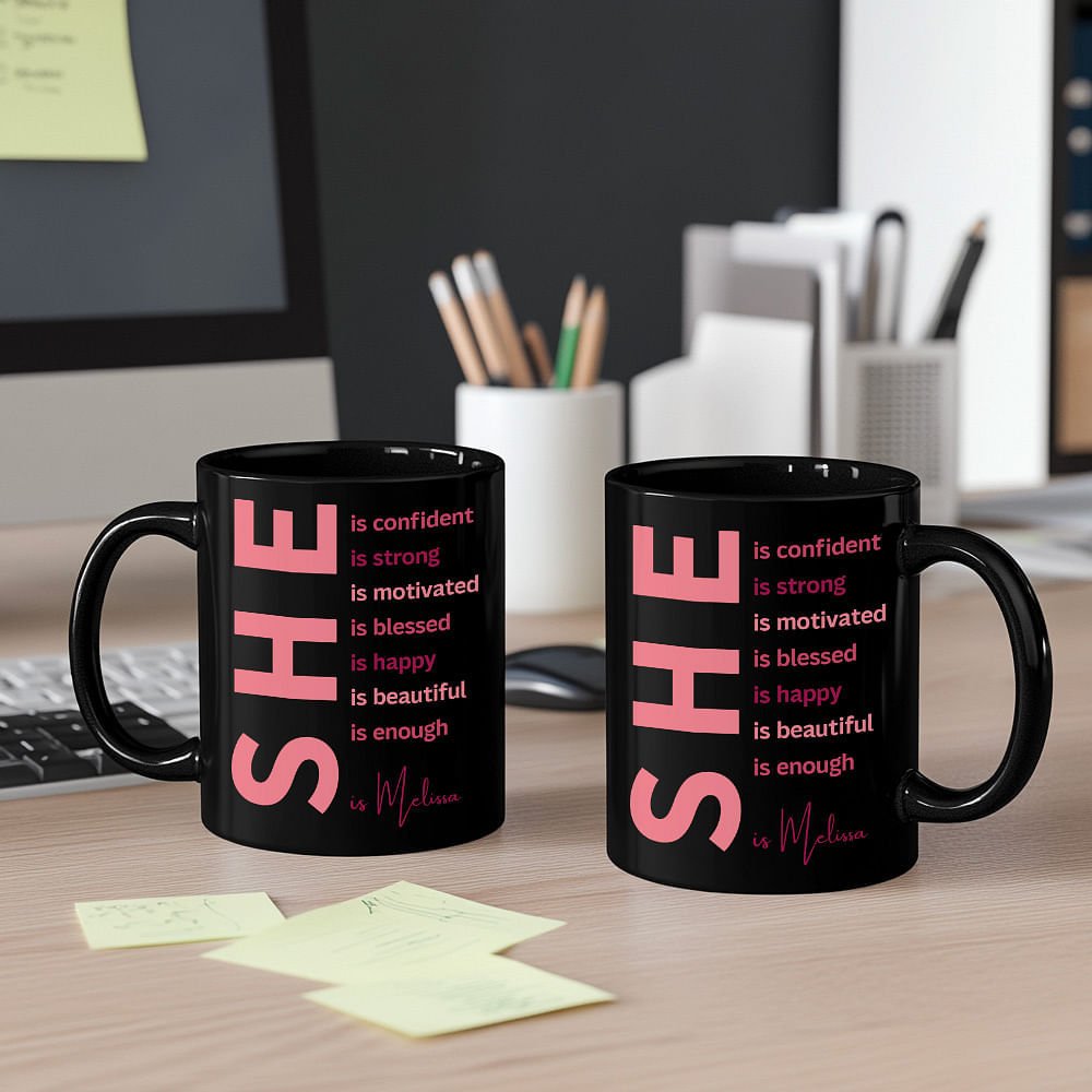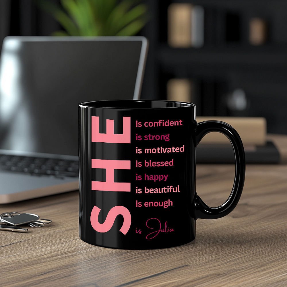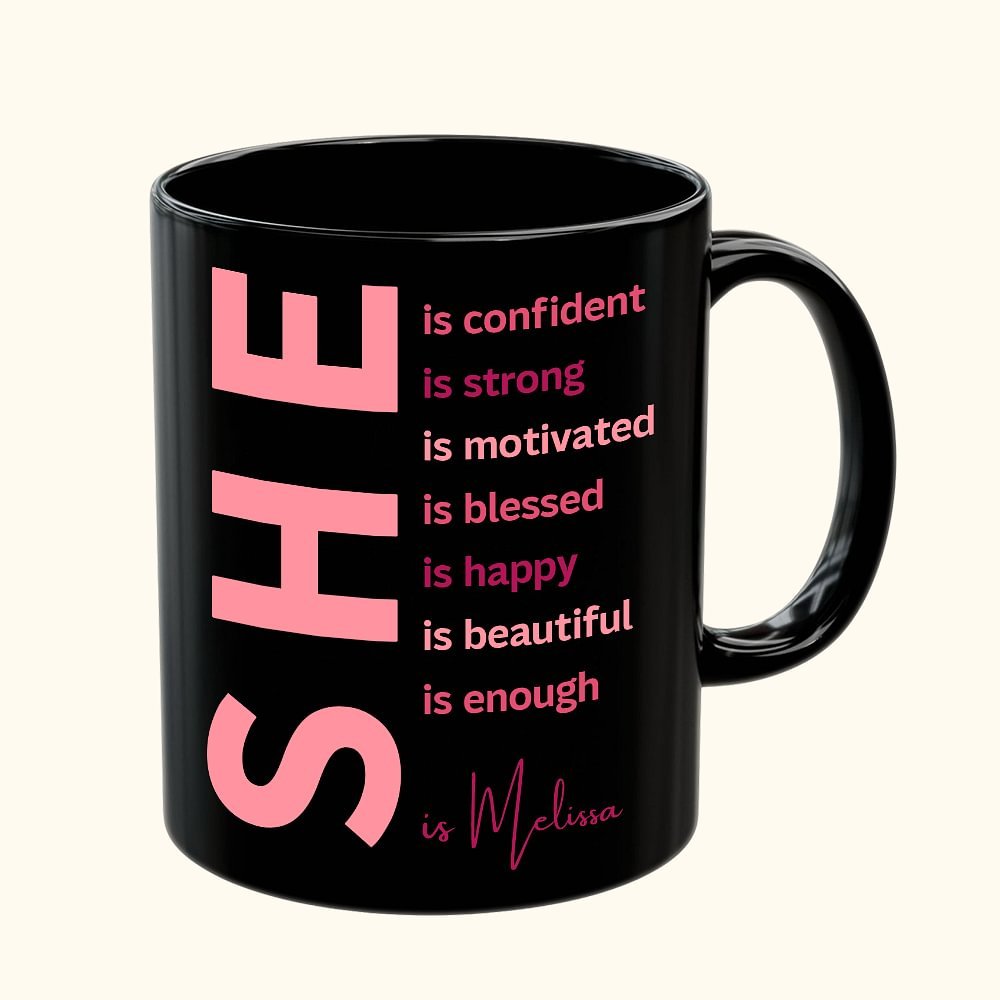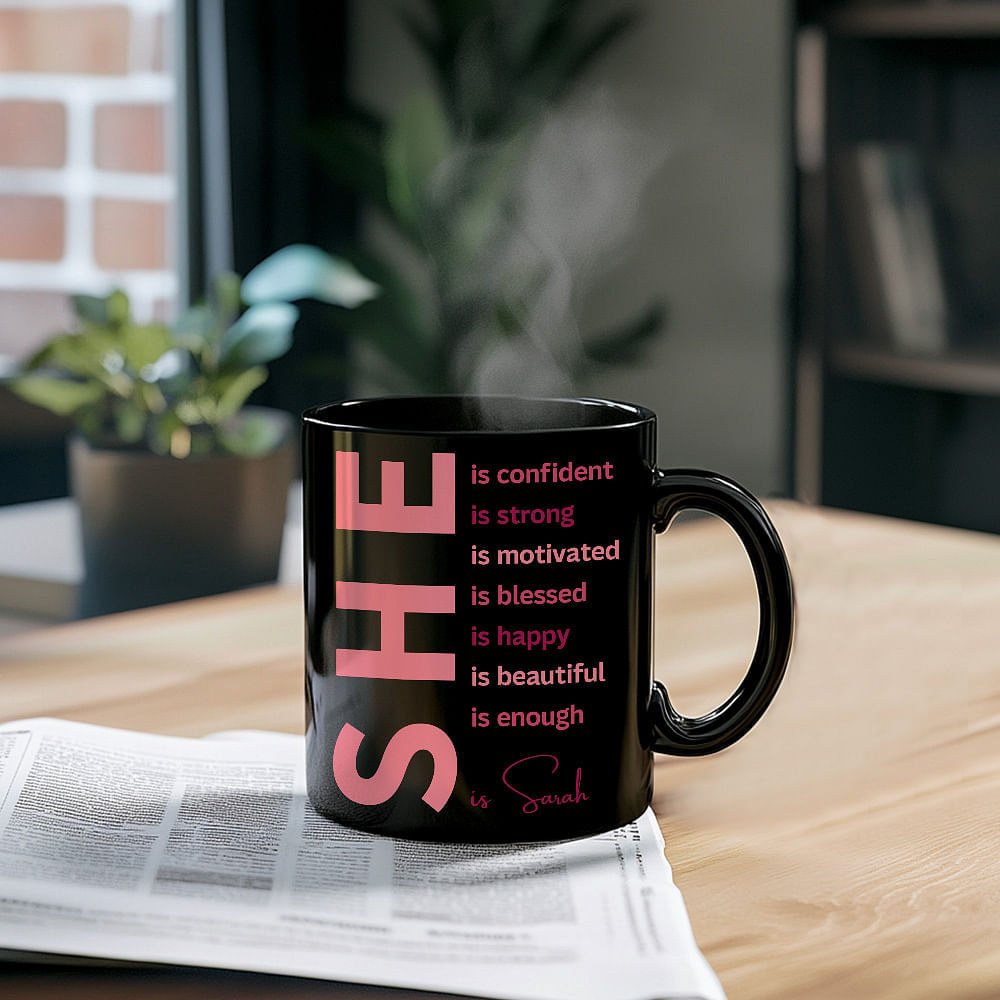 This personalized 11oz black ceramic coffee mug showcases bold phrases like "She is confident/strong/motivated/blessed/happy/beautiful/enough." It is a daily reminder of positivity and self-care, encouraging women to embrace their strength and confidence. You can customize it with a name or text for a unique touch.