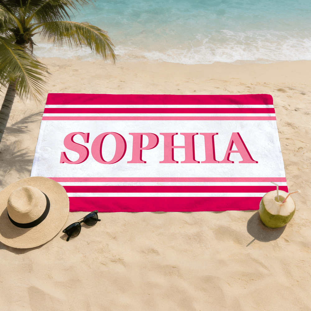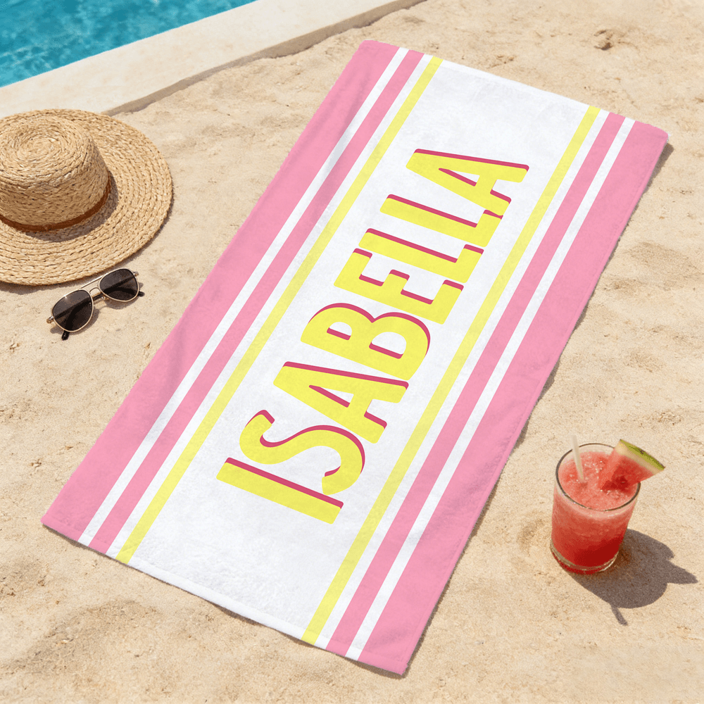 This custom beach towel features a vibrant retro color-blocked stripe design, paired with a bold shadow letter effect for a layered, eye-catching look. Fully customizable, you can add any name, initials, or personal text in the iconic shadow font, turning a classic beach essential into a one-of-a-kind accessory that stands out on any shoreline.