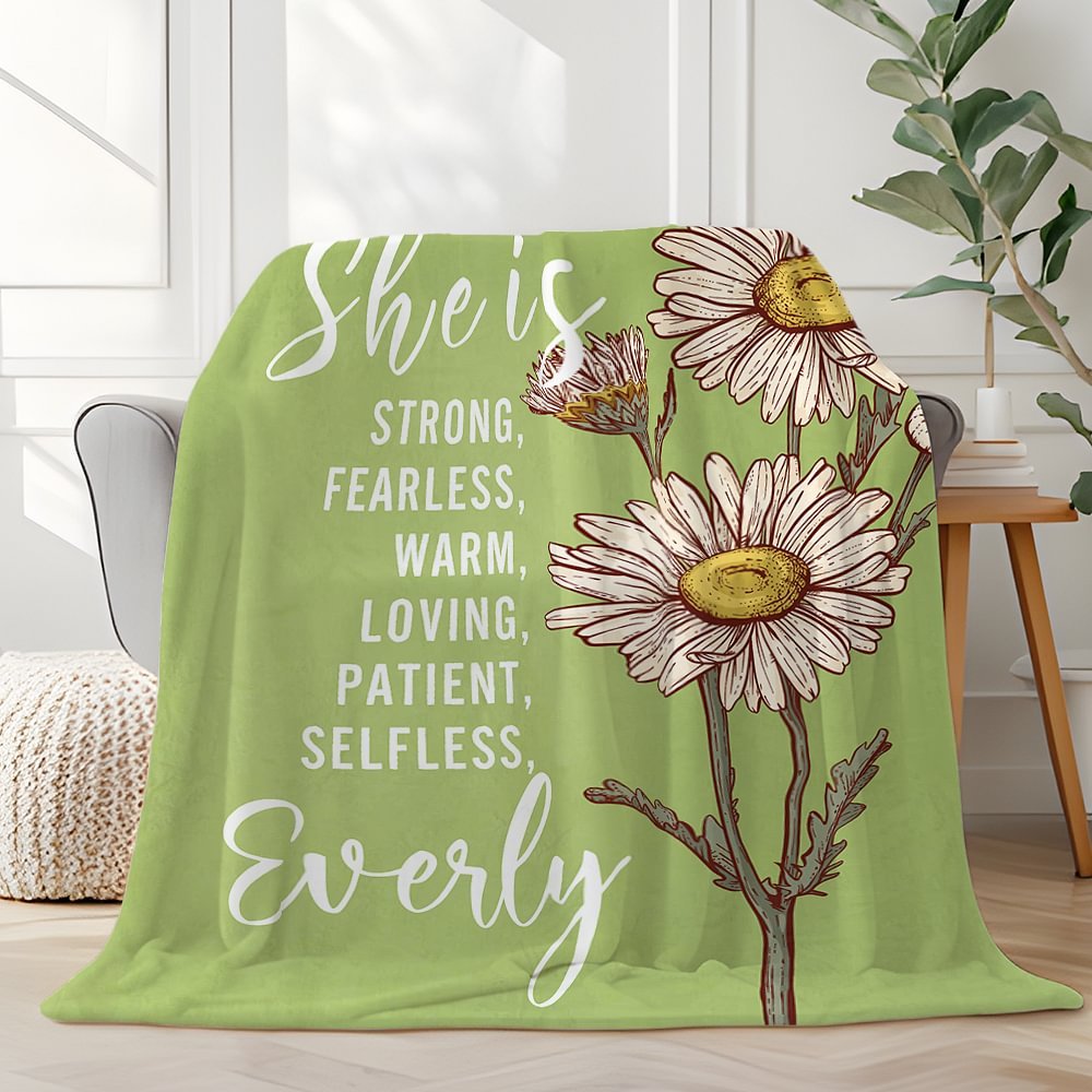 This blanket is designed with an elegant birthday flower, paired with the copywriting "She is STRONG, FEARLESS, WARM, LOVING, PATIENT, SELFLESS", showing the beautiful qualities of women. You can add your name to create a unique home essential.