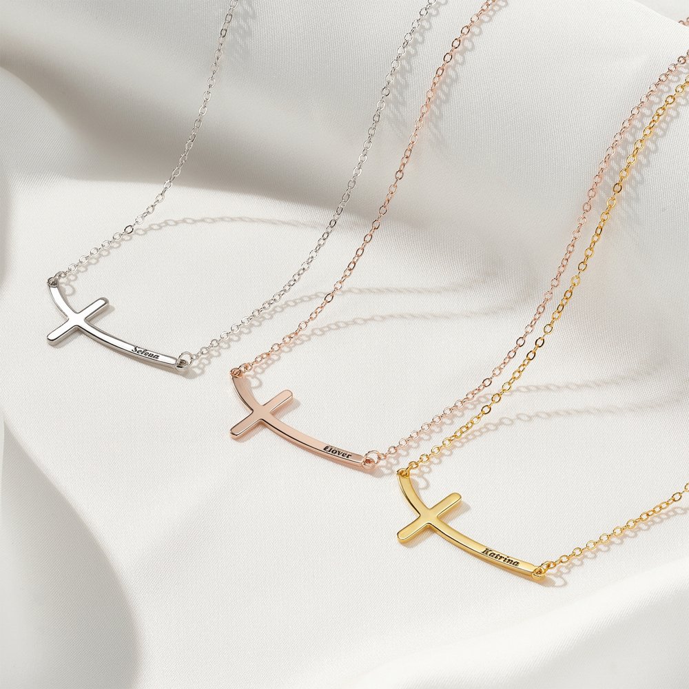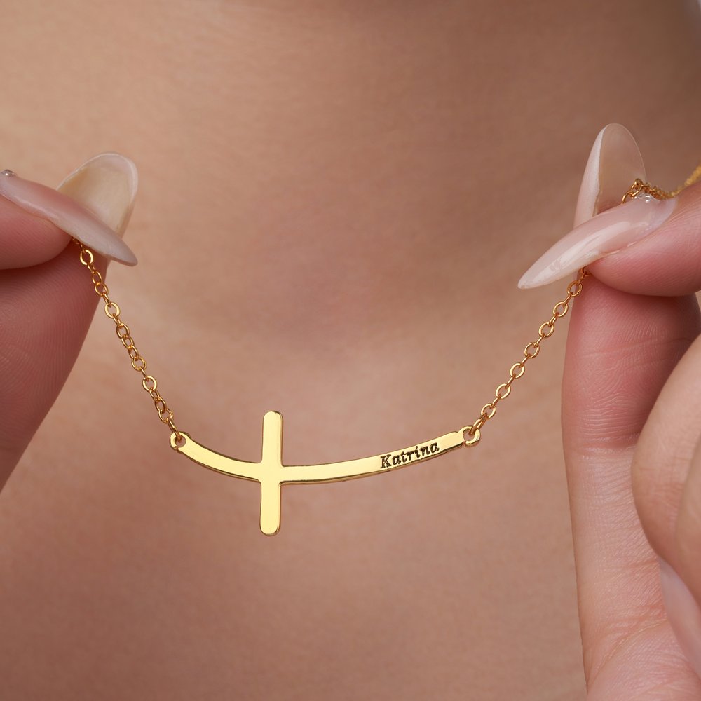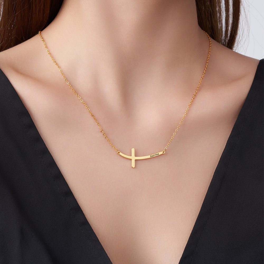 This necklace features a curved cross design. You can engrave your name, baptism date, or any other text you wish to customize. This makes the necklace more than just an accessory; it becomes a lasting testimony of faith, personality, and meaning.