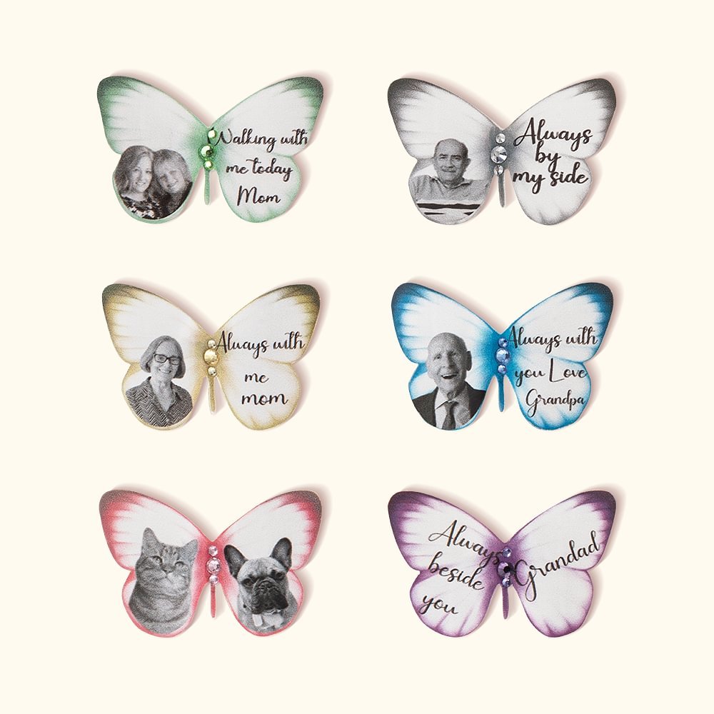 This butterfly brooch is cut from soft silk. It has a customizable design, you can upload any picture and fill in any text to make it a unique brooch.