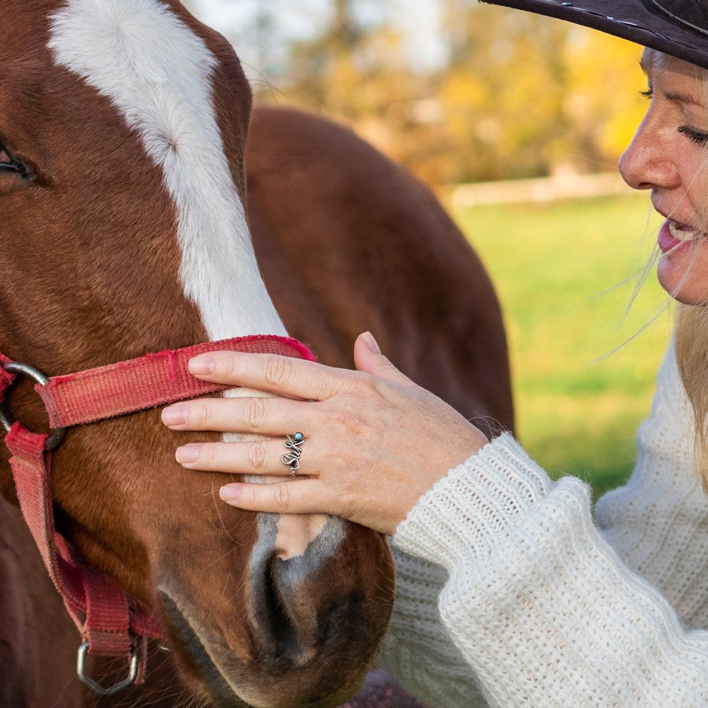 The design of this ring is inspired by the classic western cowgirl culture. Each ring can be customized with initials representing personal identity. The initials are designed with simple lines, which are both modern and classic. The embellishment of turquoise adds a touch of natural color and mystery to the overall design.