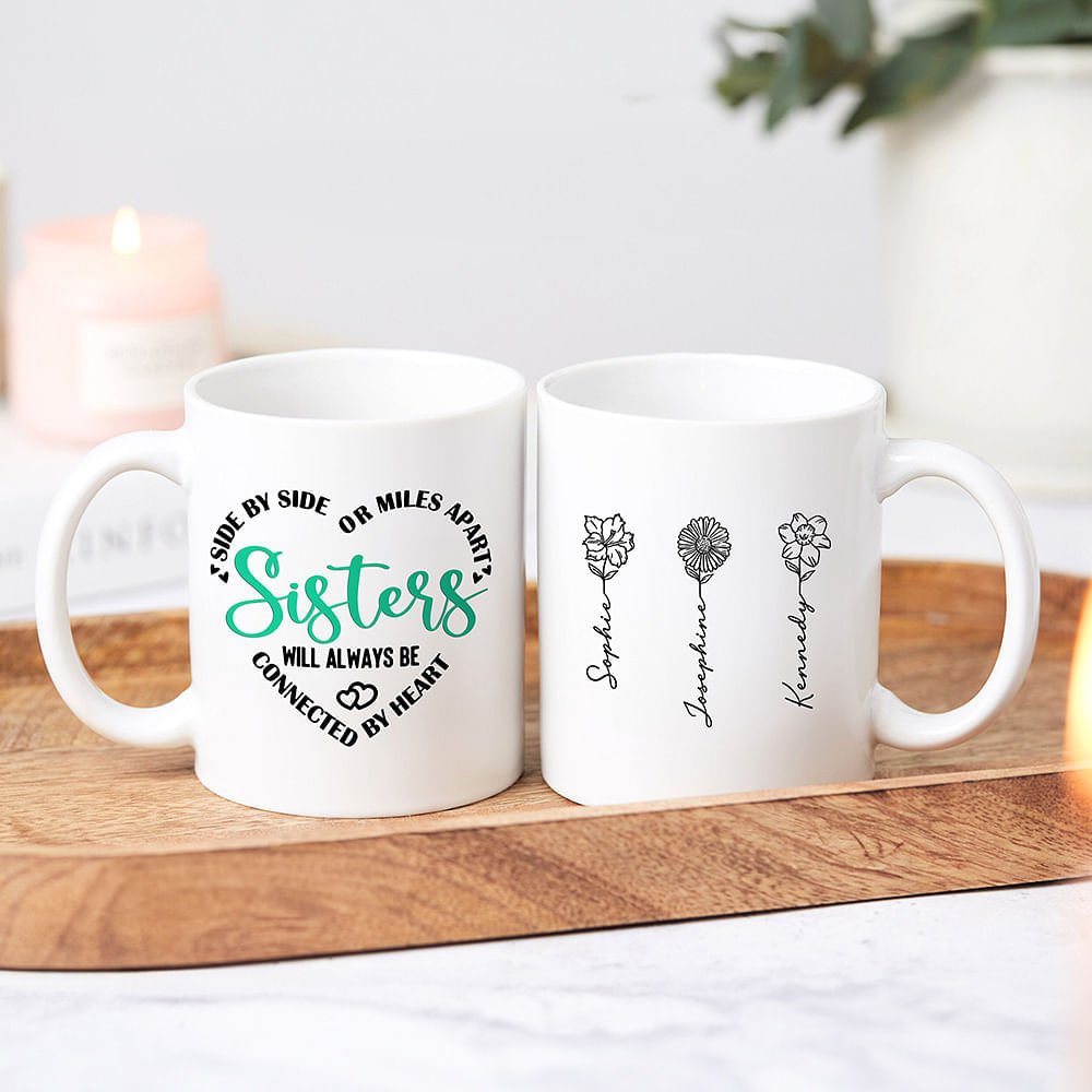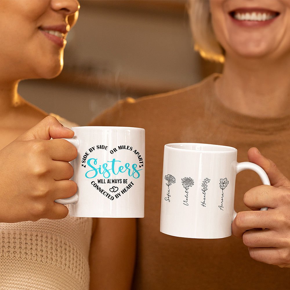 This personalized mug is designed for those who cherish sisterhood. The heart pattern is composed of the phrase "Side by side or miles apart sisters will always be connected by heart." 2-10 names and corresponding birth flowers can be customized on the back, making this gift unique and a bridge for emotional communication between sisters.