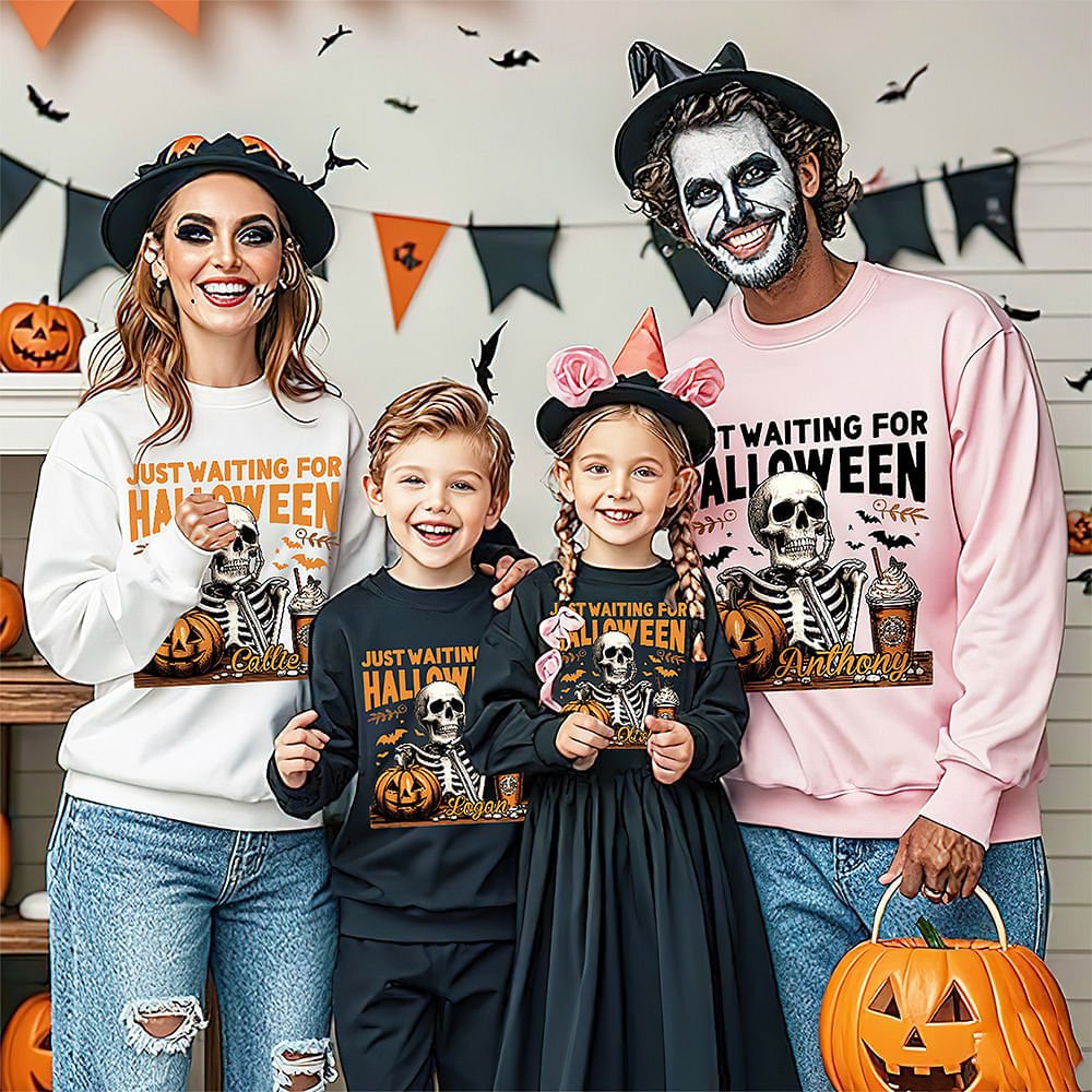 Featuring the phrase "JUST WAITING FOR HALLOWEEN" alongside iconic Halloween symbols like skulls, jack-o'-lanterns, and bats, this T-shirt or sweatshirt captures the essence of Halloween, making it a must-have for anyone who loves to celebrate this eerie holiday.