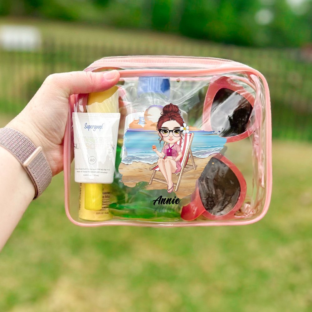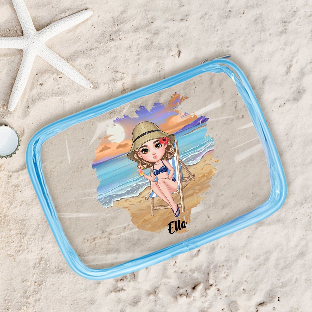 Our makeup bags have cartoon characters on vacation printed on the front, with a beautiful sky blue or sunset as the background. There are 10 backgrounds for you to choose from, full of summer atmosphere, making people feel comfortable and cool. You can match the cartoon characters according to the images of your family and friends, and add their names to create a unique makeup bag.