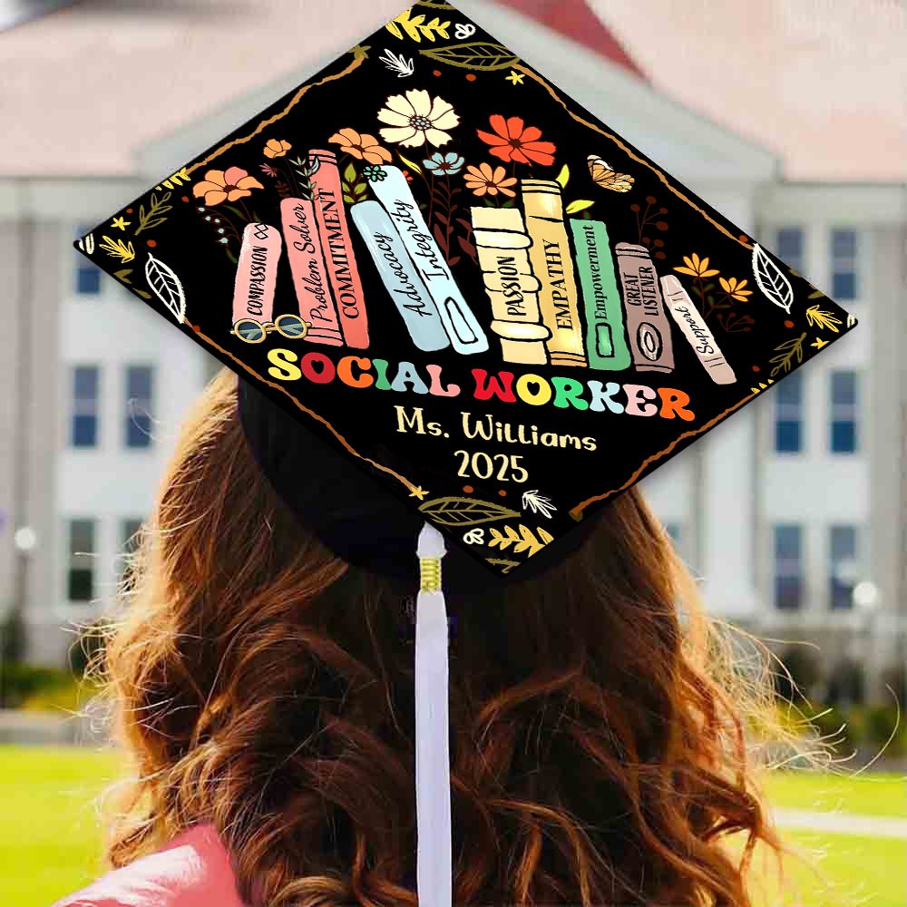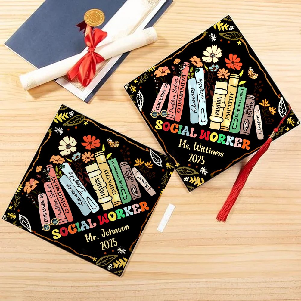 The bottom of this graduation cap decoration is printed with the eye-catching words "SOCIAL WORKER", highlighting professional identity and academic achievements. It is also decorated with colorful book patterns, each of which is printed with important concepts of social work, such as "COMPASSION", "ADVOCACY", "EMPOWERMENT", etc., which deeply reflect the essence of the social work profession. In addition, the decoration is embellished with exquisite flowers and natural elements, adding an elegant and celebratory atmosphere. A customizable name and graduation year make it more exclusive.