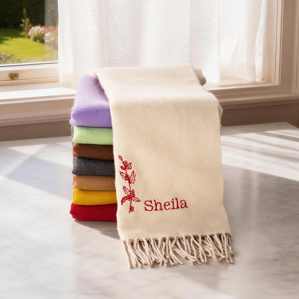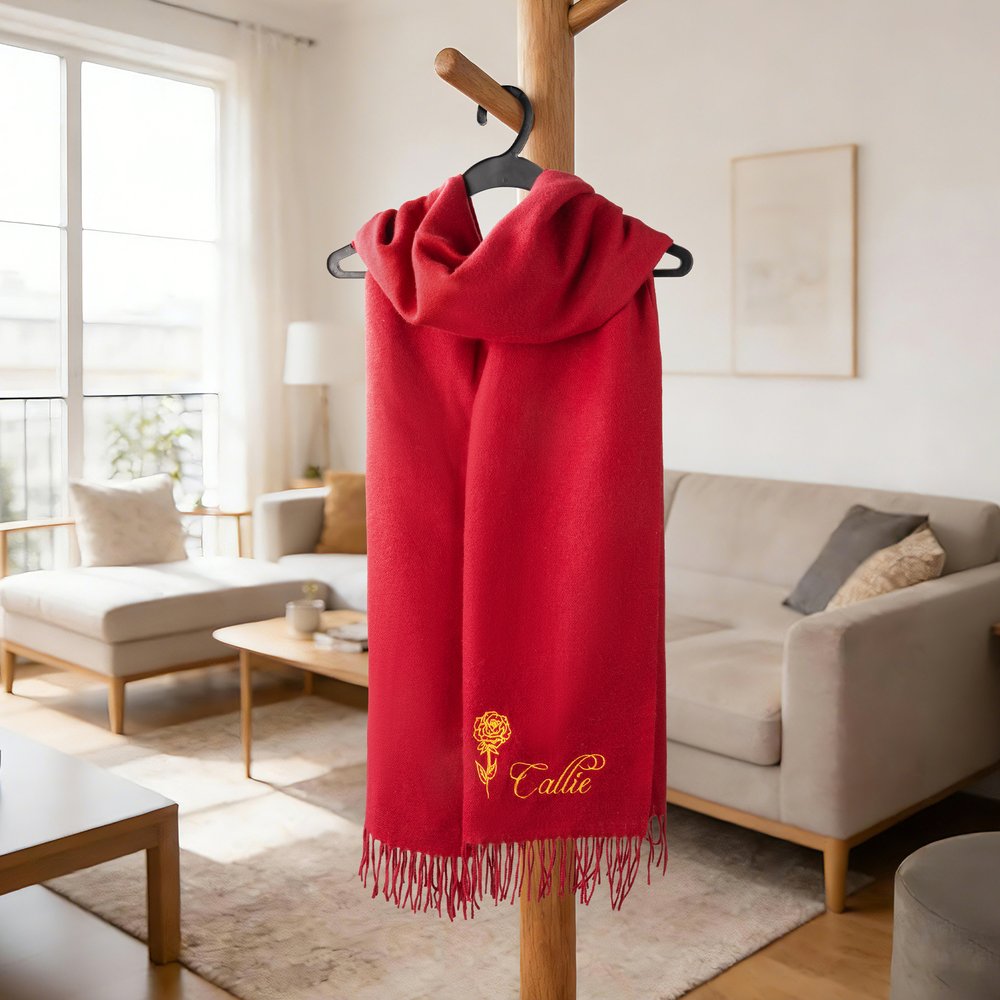 This scarf is a customized design featuring birth flowers and embroidered names, signifying good wishes and personalized expression. The birth flowers add a natural flavor, while the delicate name embroidery makes this scarf even more unique.