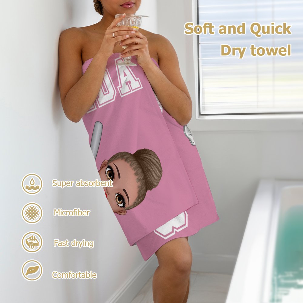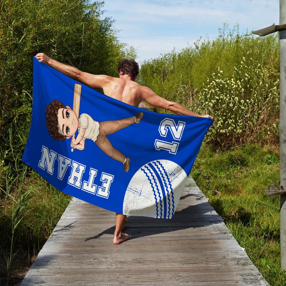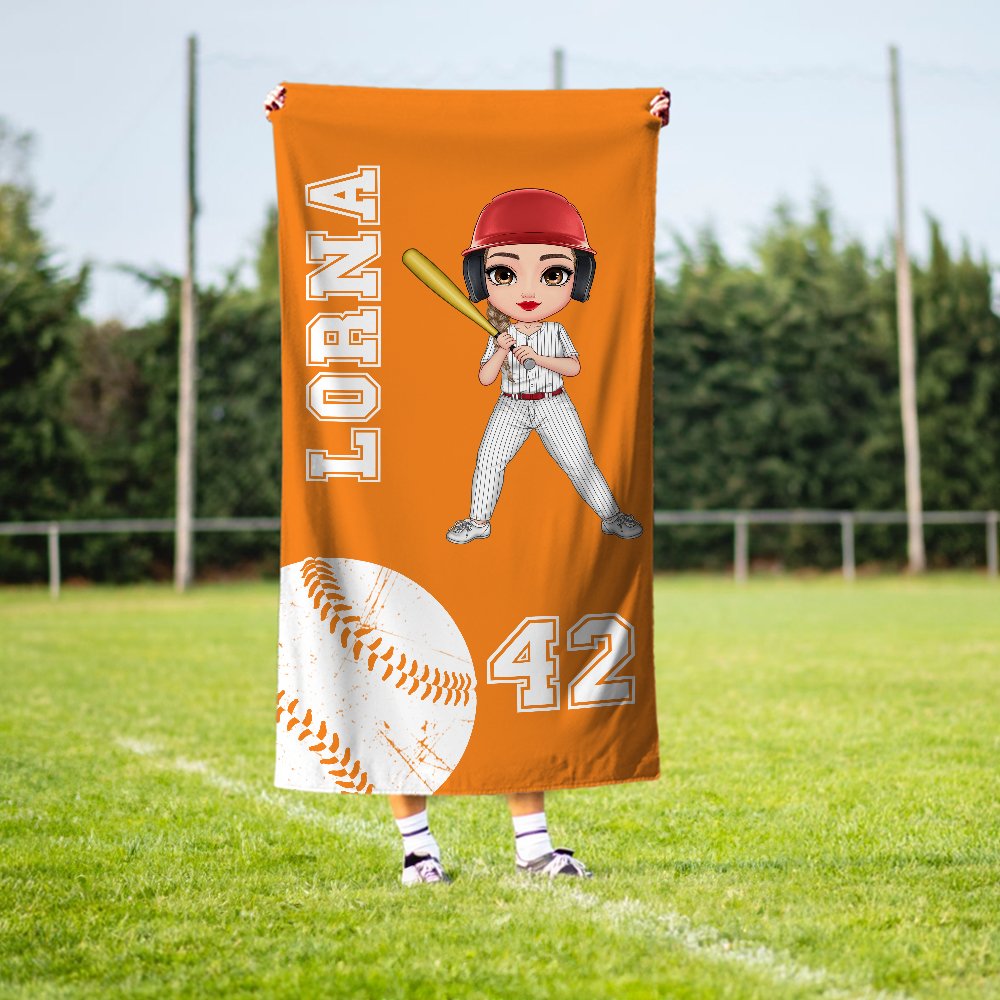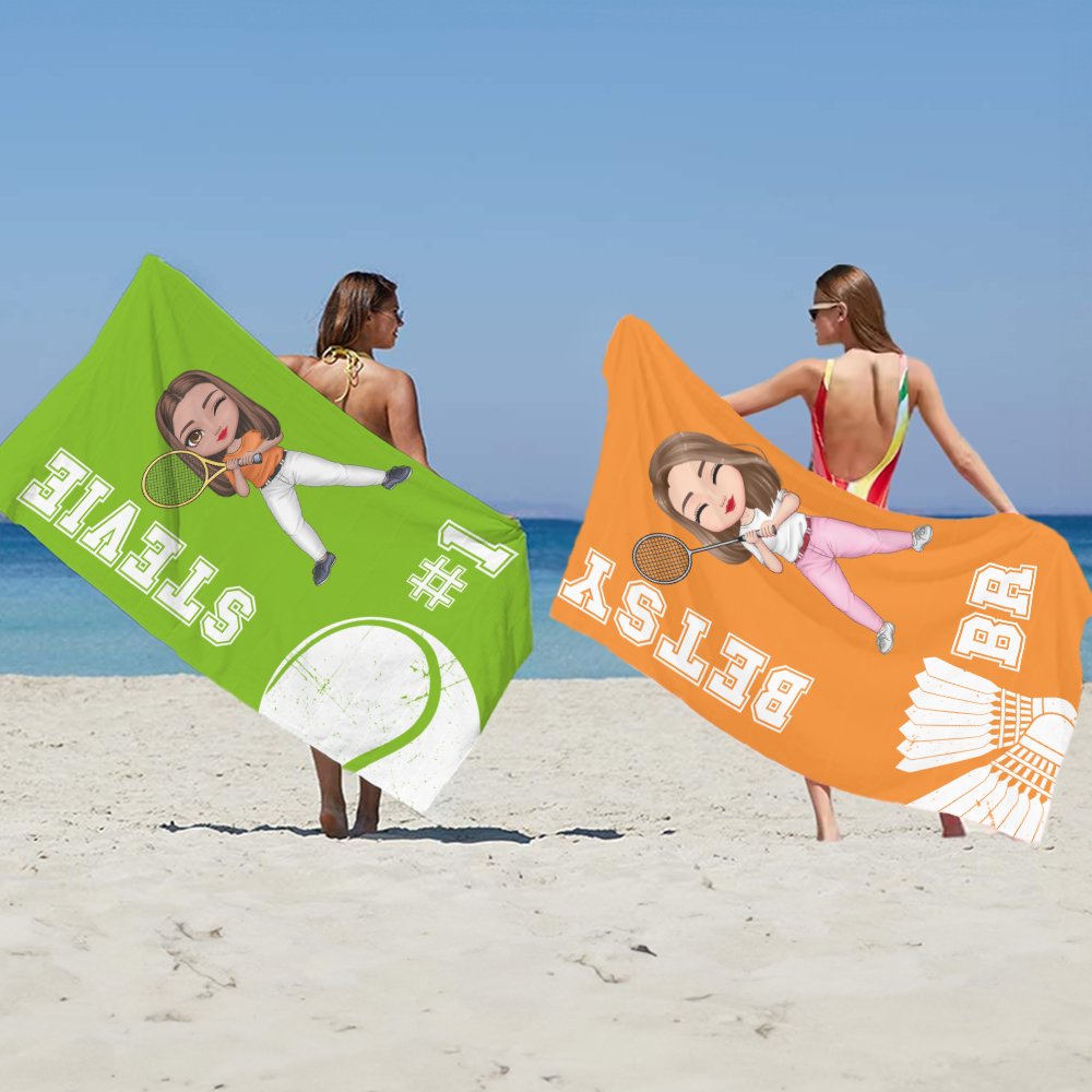 This beach towel is designed with female or male cartoon characters and 5 different ball sports, including softball, baseball, cricket ball, badminton, and tennis ball, and each sport represents a kind of love and passion. With 23 colors, you can freely combine and customize your number and name to create your exclusive style.