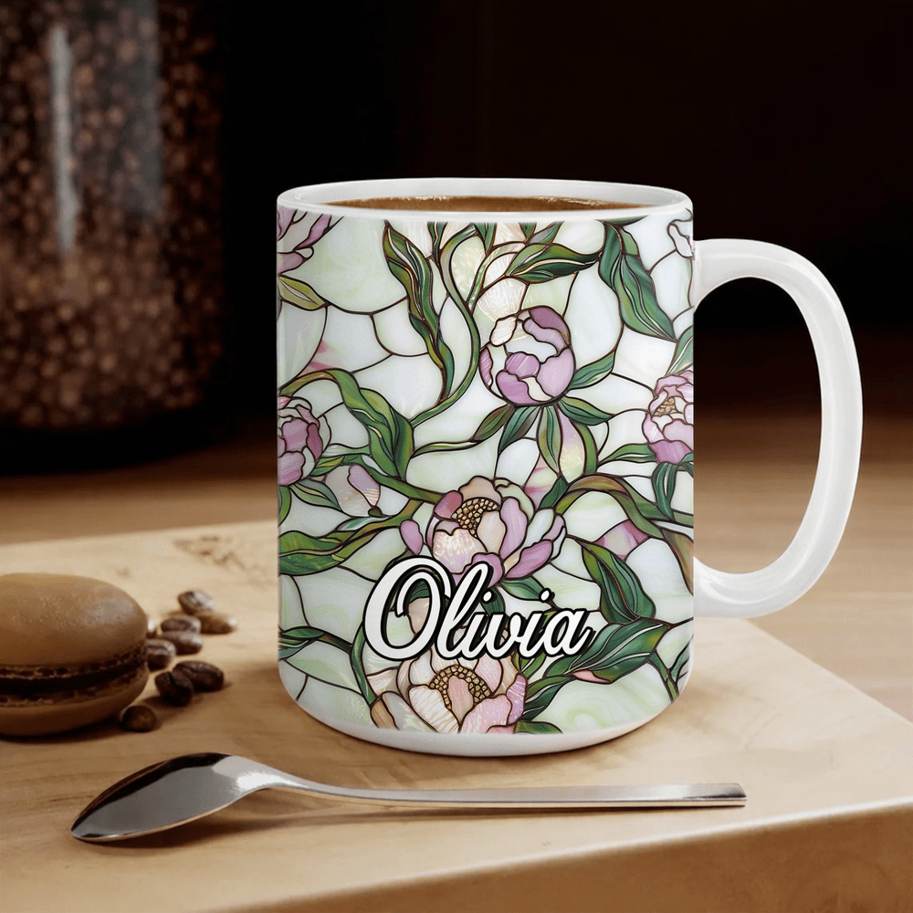 Add a touch of vintage charm to your everyday routine with our floral mugs inspired by stained-glass art. Personalize it with a name to create a one-of-a-kind mug that feels truly yours. That simple detail turns an ordinary cup into a personal signature—making every sip feel more special, like a small ritual of refined living.