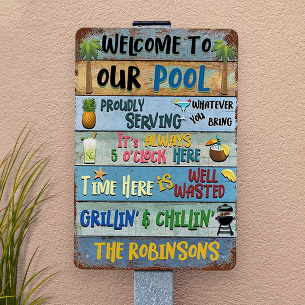 Embodying the spirit of “It's Always 5 O'Clock Here” and “Time Here Is Wasted Grillin' & Chillin,” this sign captures the essence of relaxed outdoor living. It boasts an eye-catching and vibrant design, featuring lively colors like red, blue, and yellow. This unique blend of modern aesthetics and retro signage creates a cheerful atmosphere, making it the perfect decorative piece for any backyard or outdoor space.