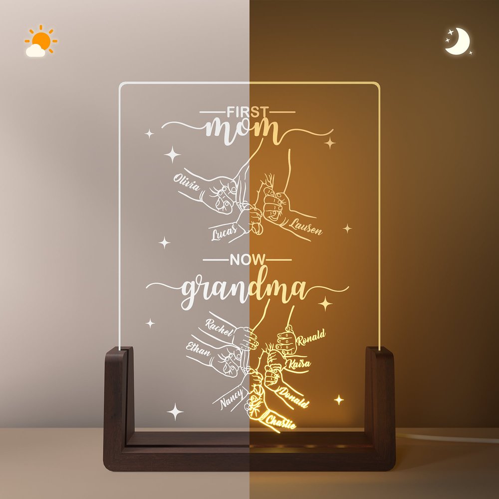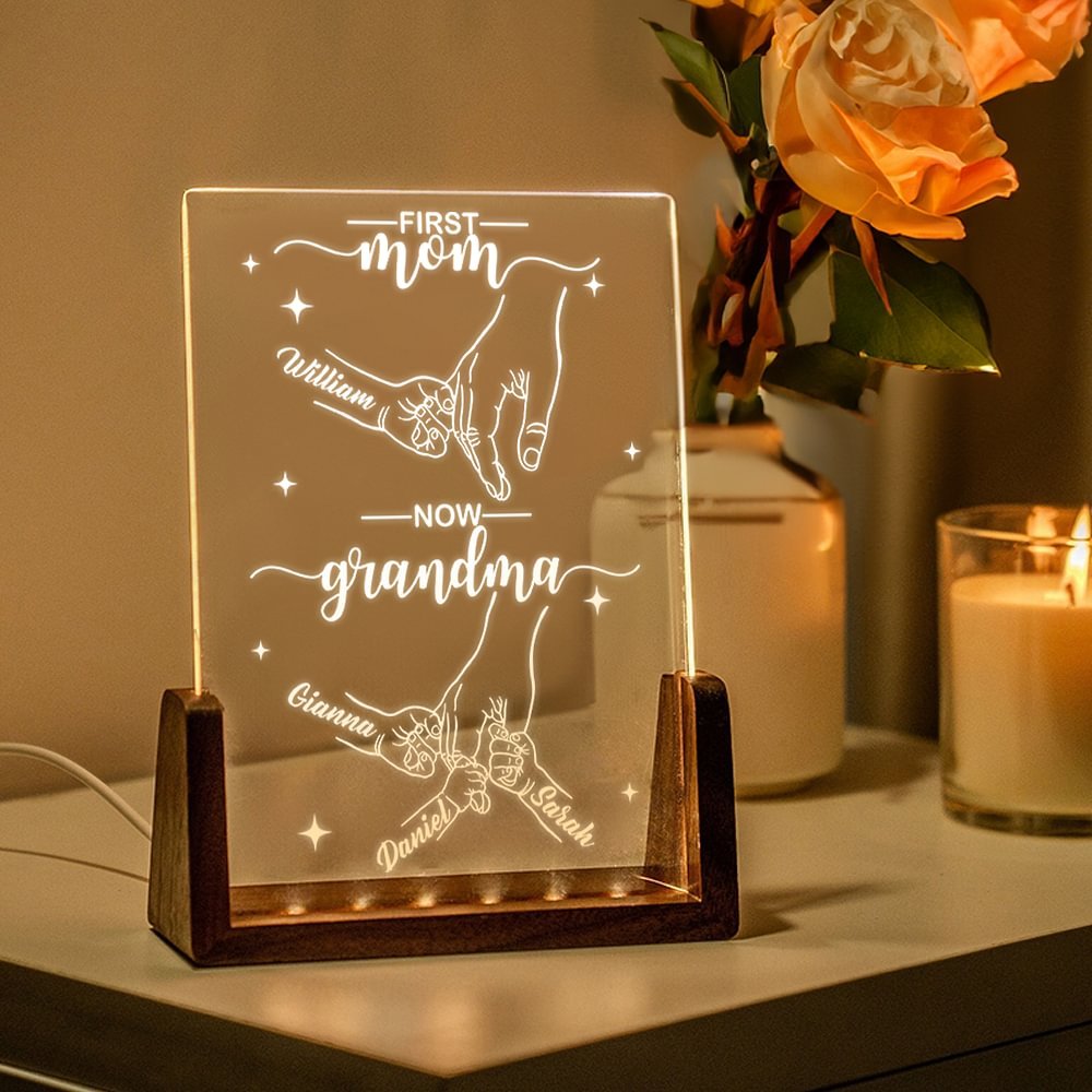 Personalized Star Hand in Hand Design LED Night Light with Names and Wooden Base Mother's Day Home Decor Birthday Gift for Mom Grandma
