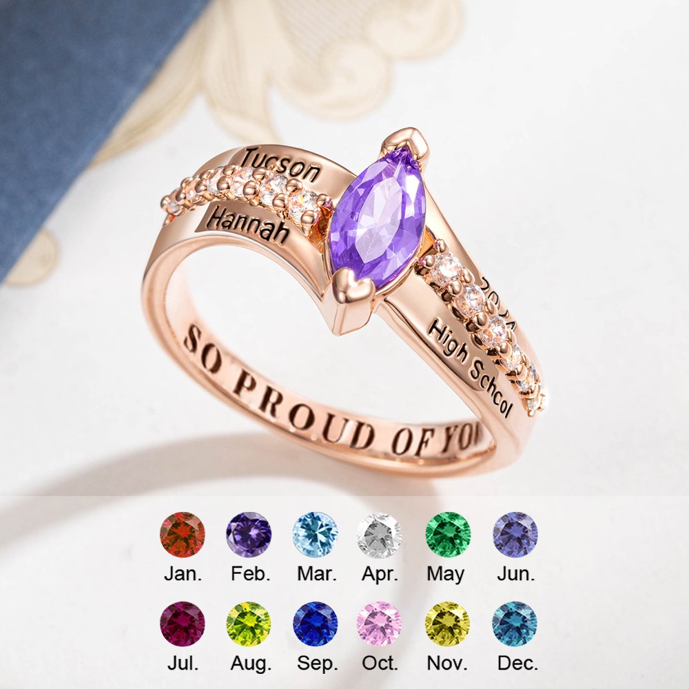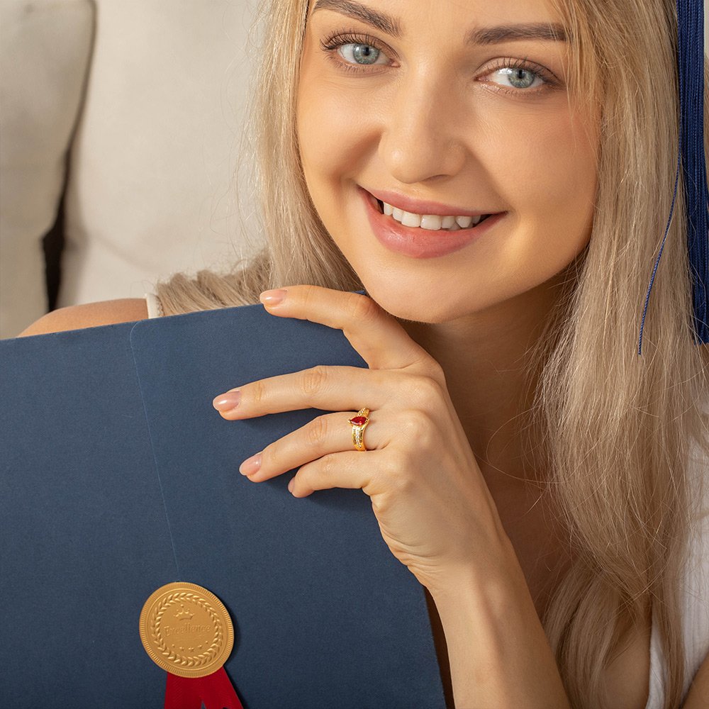 Reflect your graduate story with a variety of customization features. The ring band has a peculiar shape that wraps around your finger like a ribbon. From birthstones to phrases, from your school to your name, every part of the ring is personally designed by you, so you can celebrate your important milestones in style.