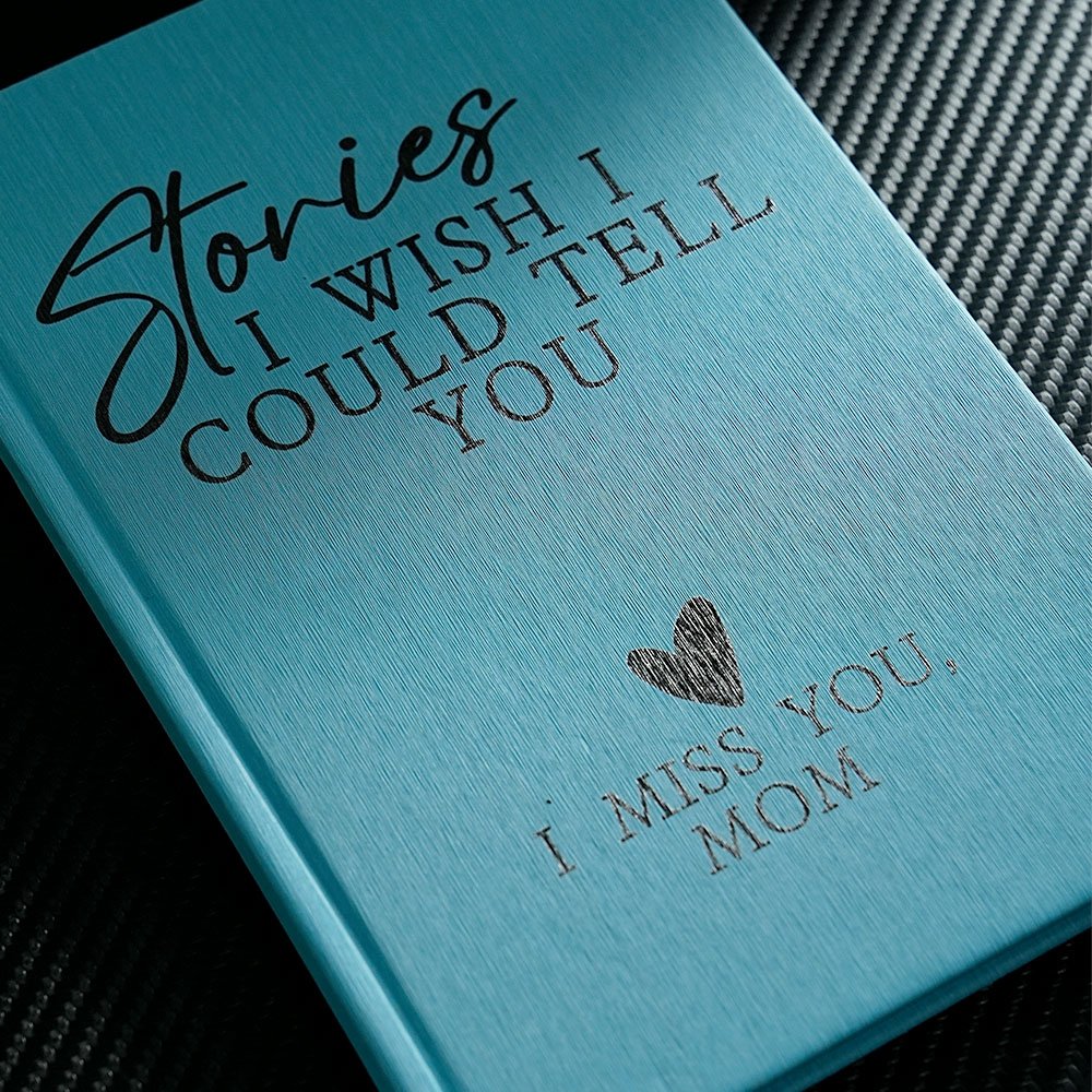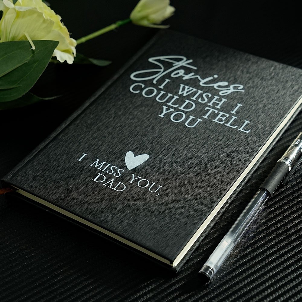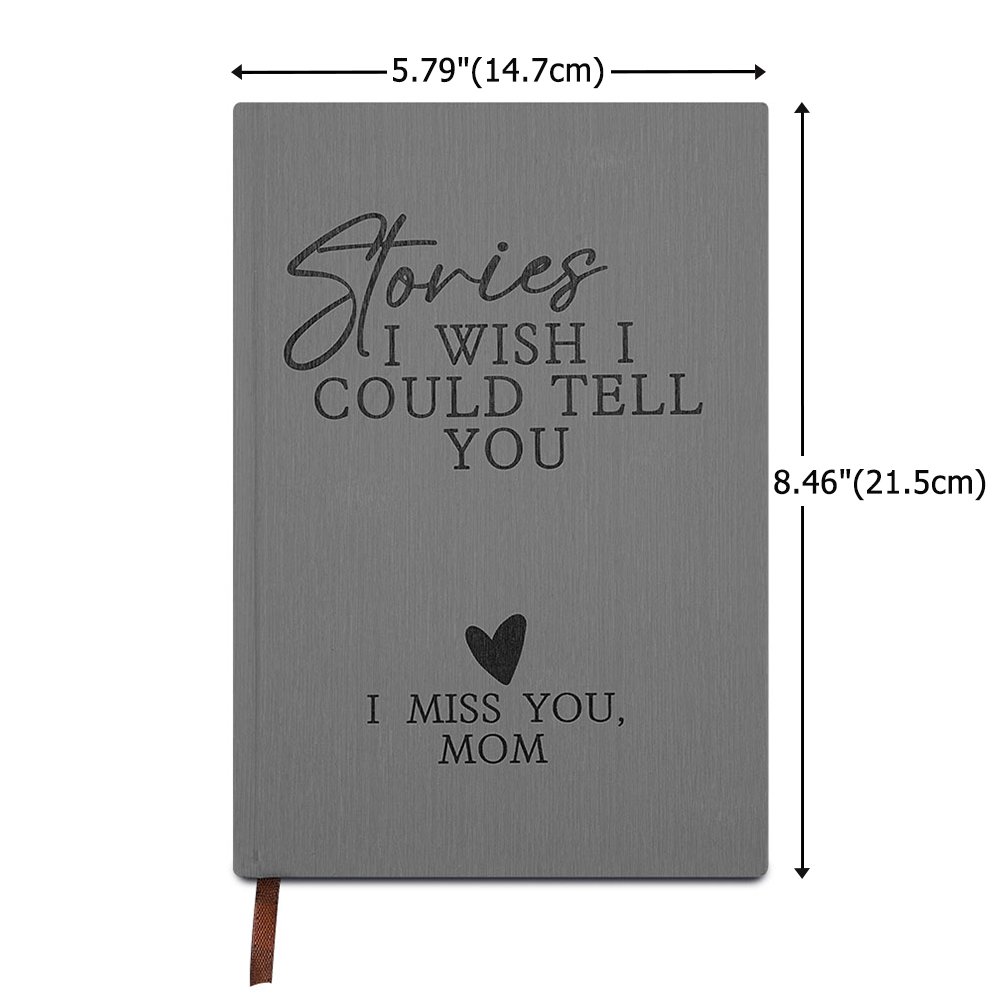This grief journal is designed as a sanctuary for processing emotions, offering a private and therapeutic space to express thoughts, memories, and feelings of loss. The cover features the poignant phrase "Stories I Wish I Could Tell You," providing a comforting reminder that unspoken words and cherished moments can be preserved.