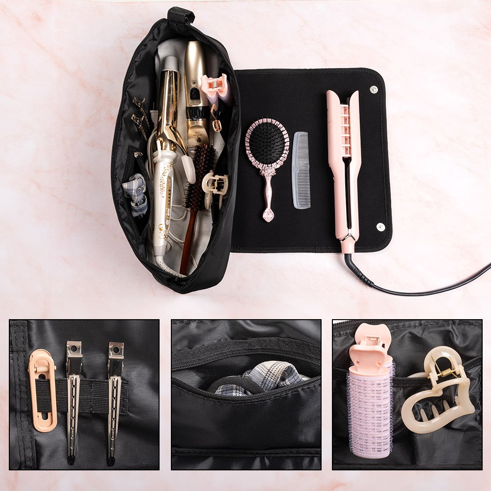 This bag comes with multiple compartments, including two internal pockets, a zippered pocket, and elastic sections for hair clips. It efficiently organizes all your hair styling tools, such as straighteners, curling irons, and brushes, keeping everything neat and within reach.