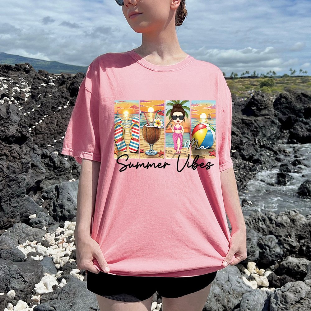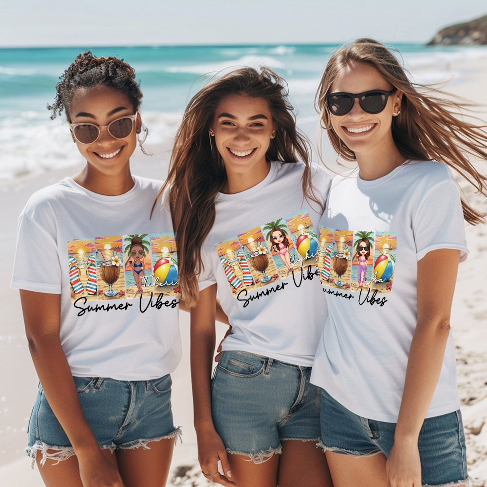The T-shirt is printed with a cute cartoon character, paired with summer elements such as beaches, palm trees, sunglasses, and drinks, creating a relaxing and cheerful summer atmosphere. In addition, the text "Summer Vibes" is printed on the T-shirt, further emphasizing the summer theme. You can also customize your name on the T-shirt to make it more exclusive.