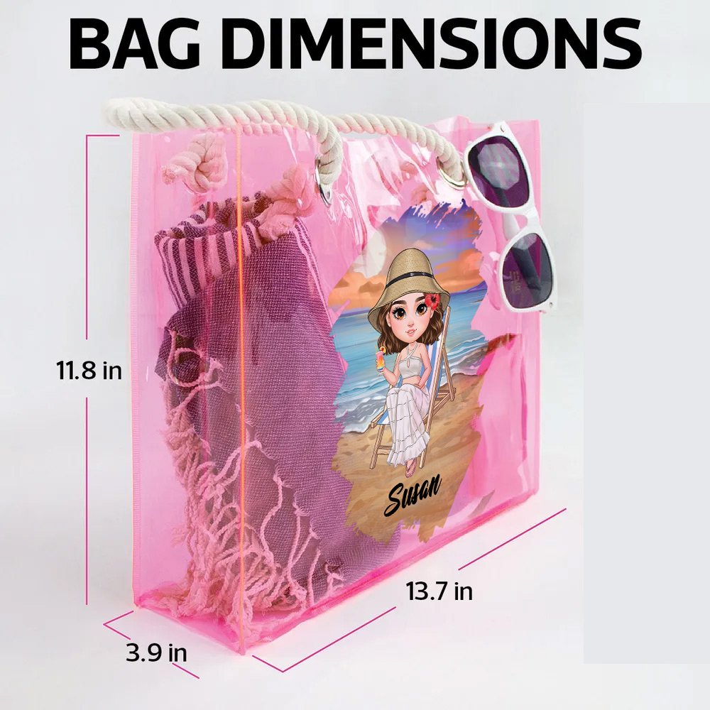 Our tote bag features an adorable cartoon character lounging on a beach chair, basking in the sunshine, and it captures the diversity and beauty of women. Moreover, you can customize your name. We provide 4 colors for you to choose from while adding a simple and fashionable element to your costume.