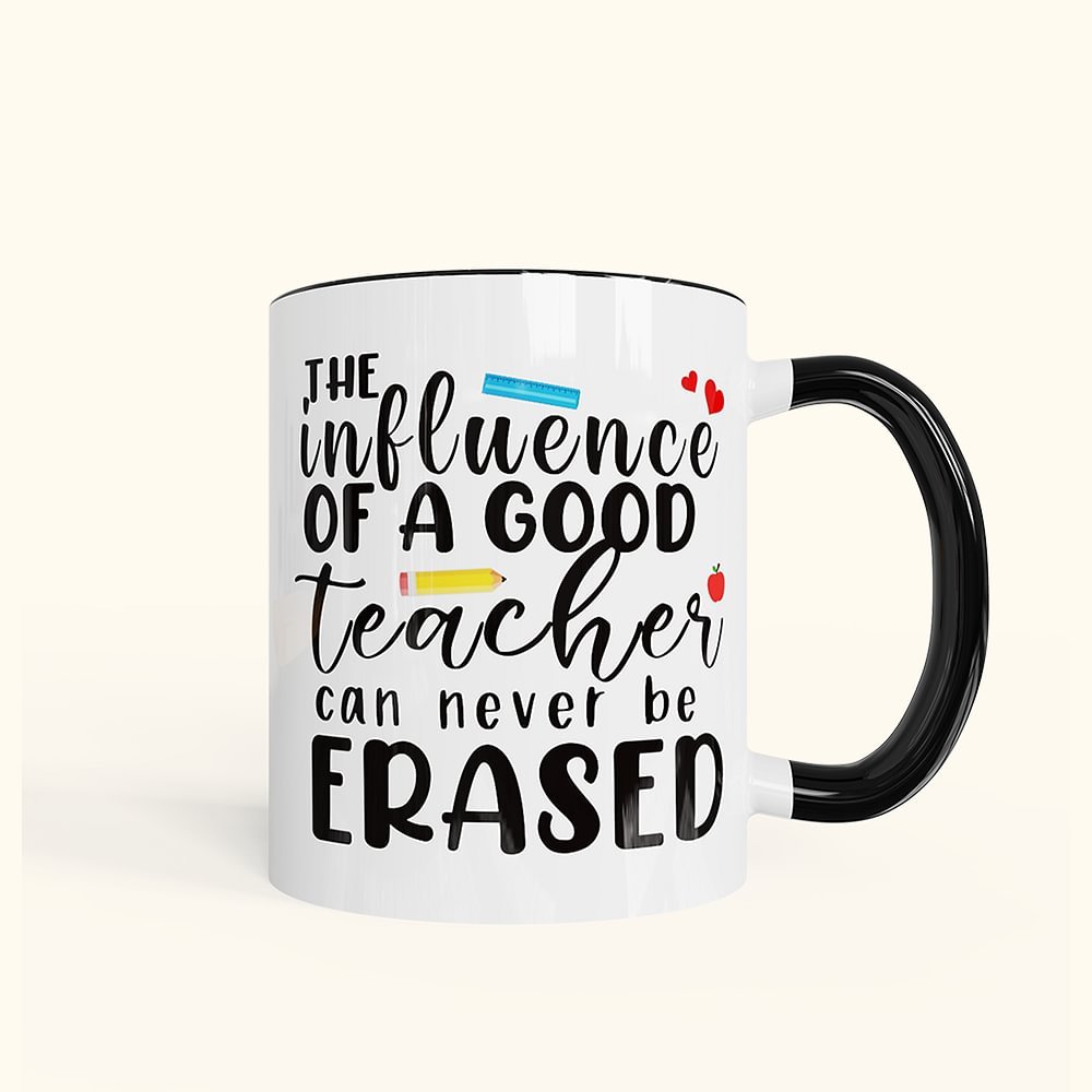 The white ceramic coffee mug is decorated with the teacher's image in a variety of elements.