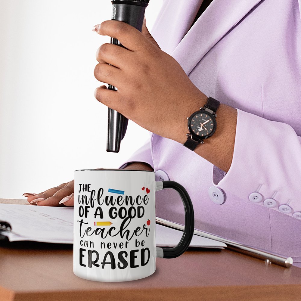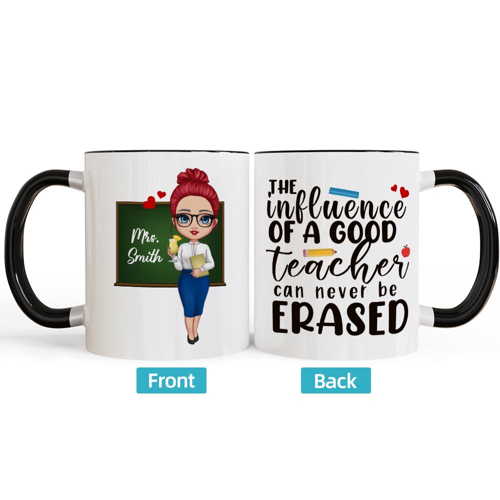 The white ceramic coffee mug is decorated with the teacher's image in a variety of elements.