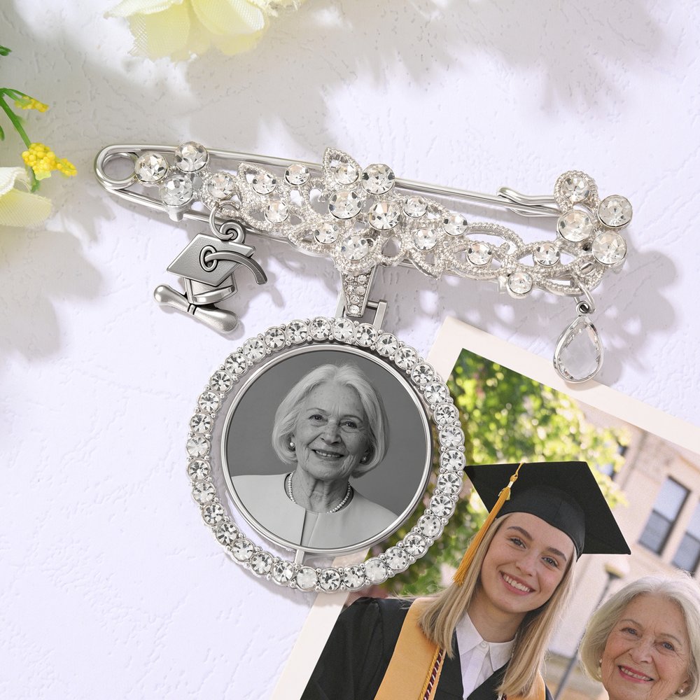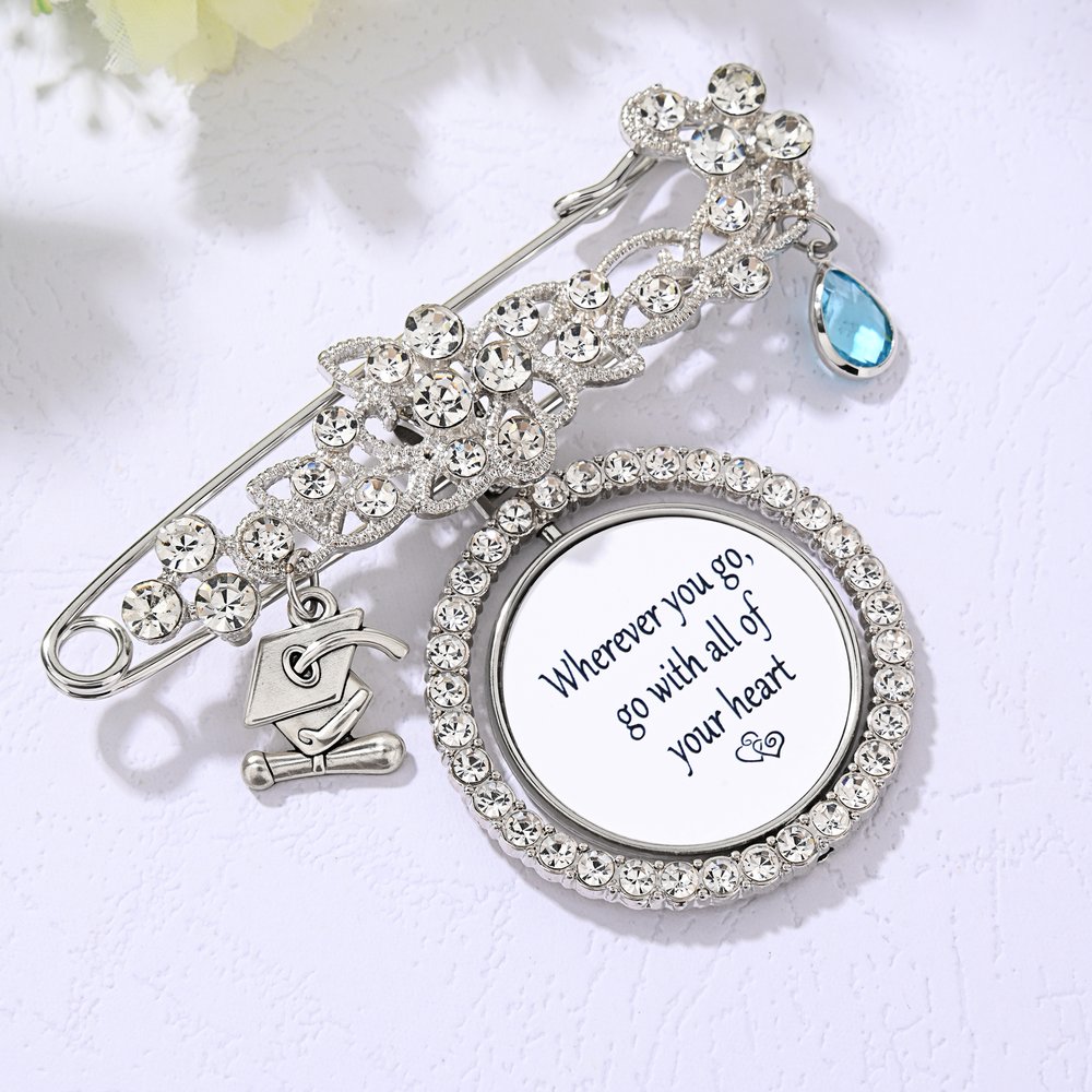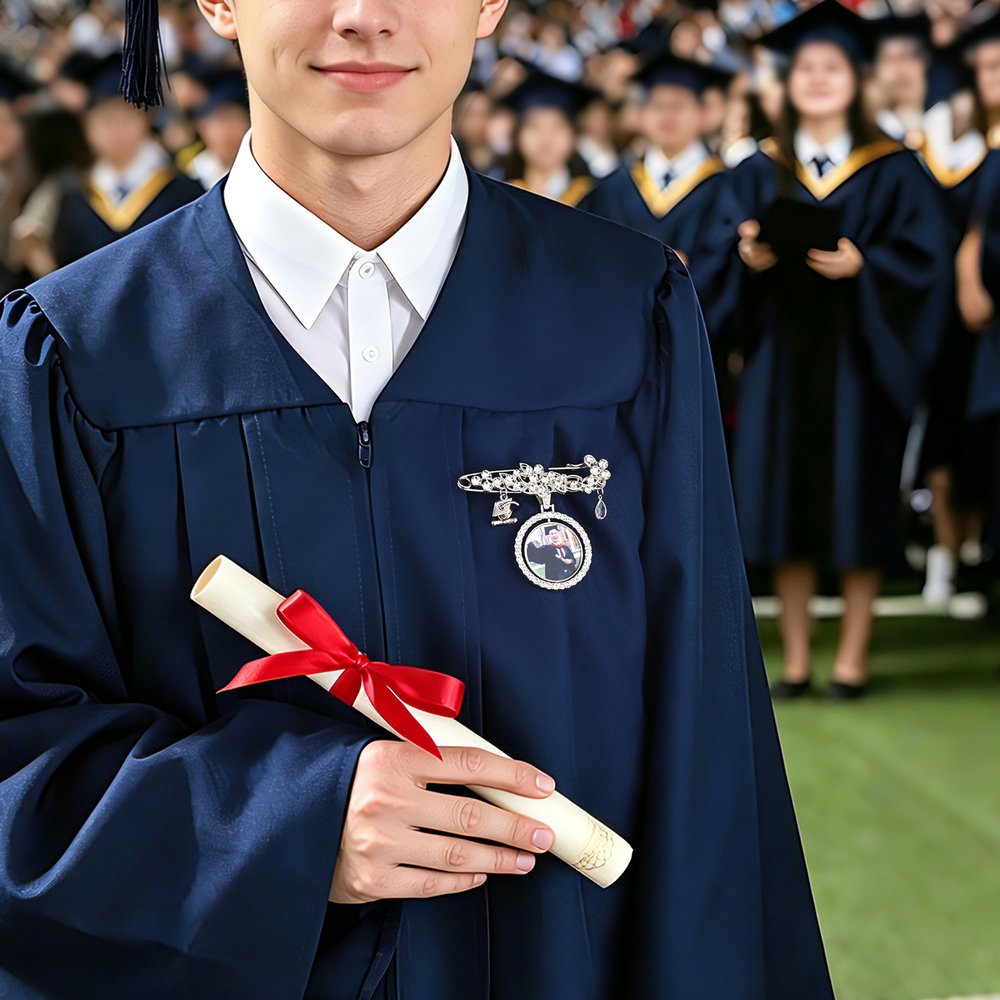 With graduation as its central theme, this design features a customizable circular photo frame at the center, surrounded by tiny crystals. A three-dimensional graduation cap pendant hangs from one side, while the other side is adorned with a teardrop-shaped birthstone. Simple yet elegant, it carries lasting commemorative significance.