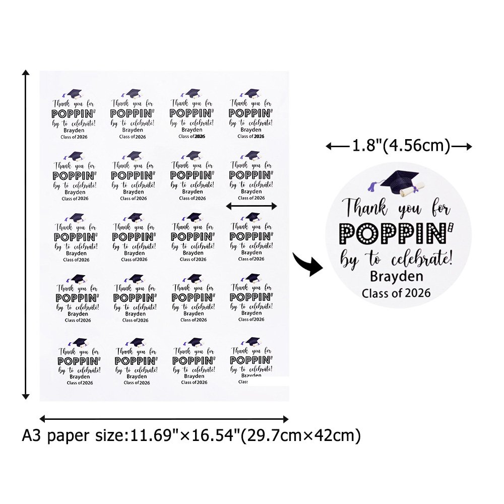 These personalized graduation stickers are ideal for celebrating the Class of 2026. Featuring a graduation cap and a custom name, they add a special touch to any graduation event. The “Thank you for poppin’ by” message is a fun play on words, connecting to popcorn and meaning "Thanks for coming to celebrate!".