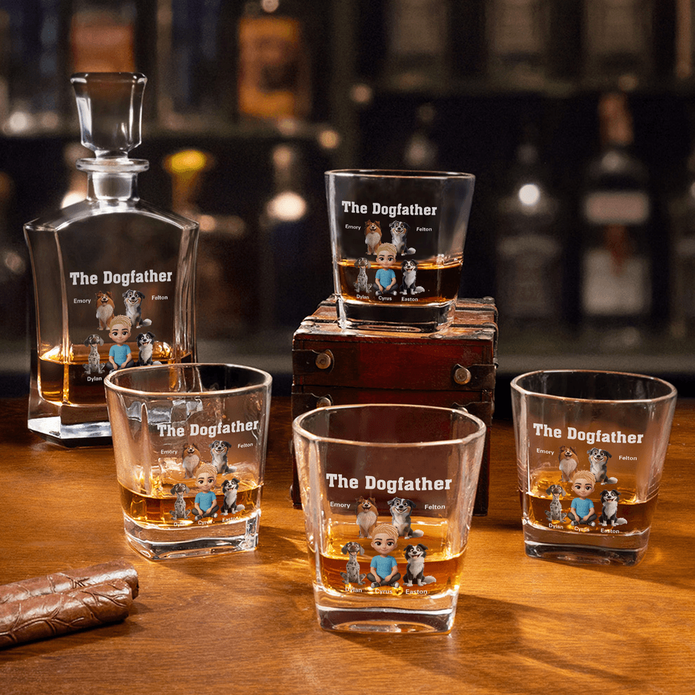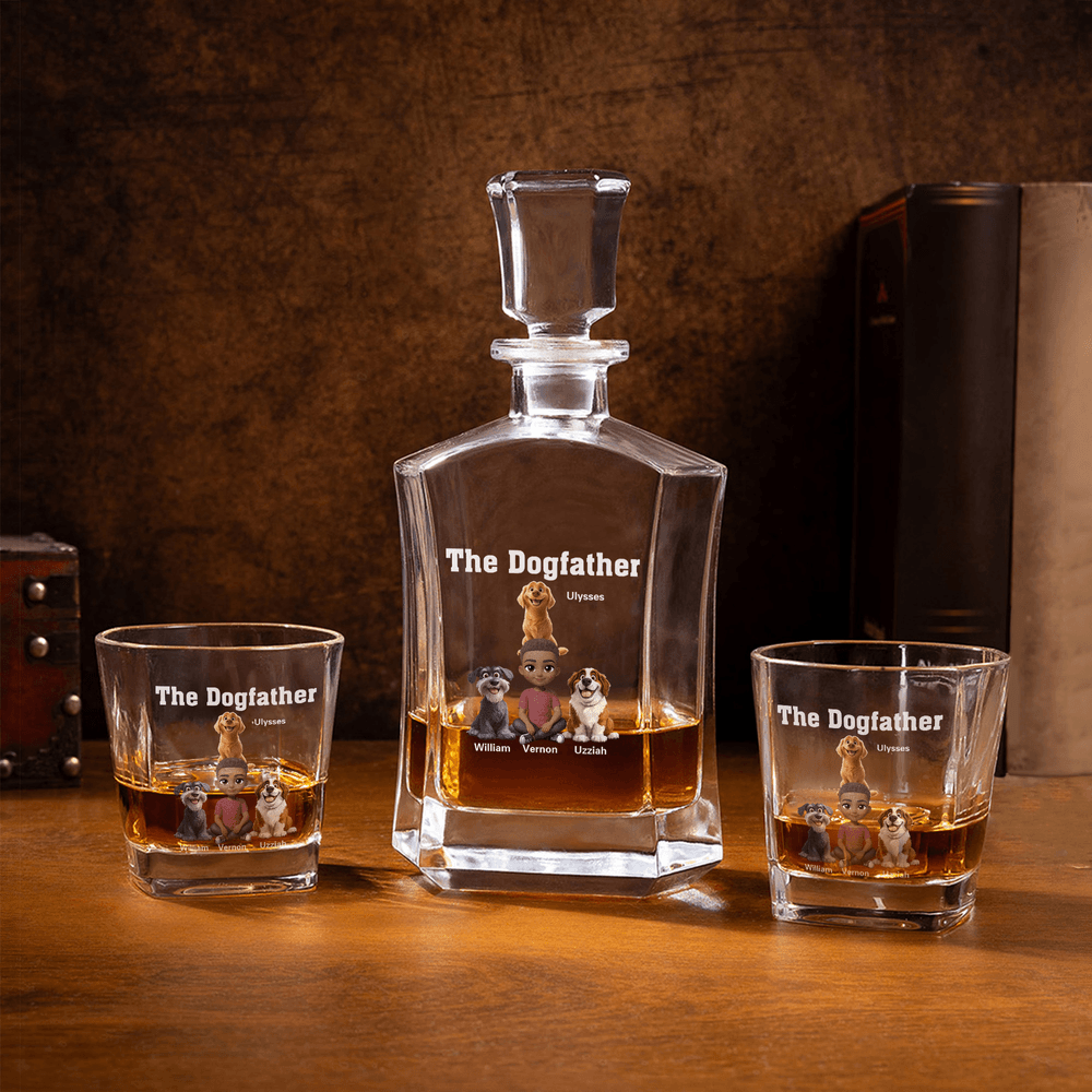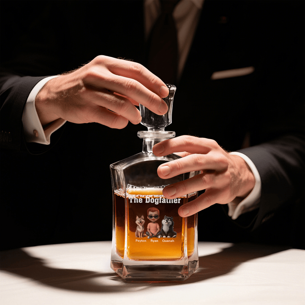 This charming whiskey decanter features a 3D cartoon boy, The Dogfather text, and 1 to 4 adorable dogs, capturing the intimate moments between a doggie dad and his furry friend as they play and frolic. The detail adds a premium, timeless touch, making it a cherished keepsake for years to come.