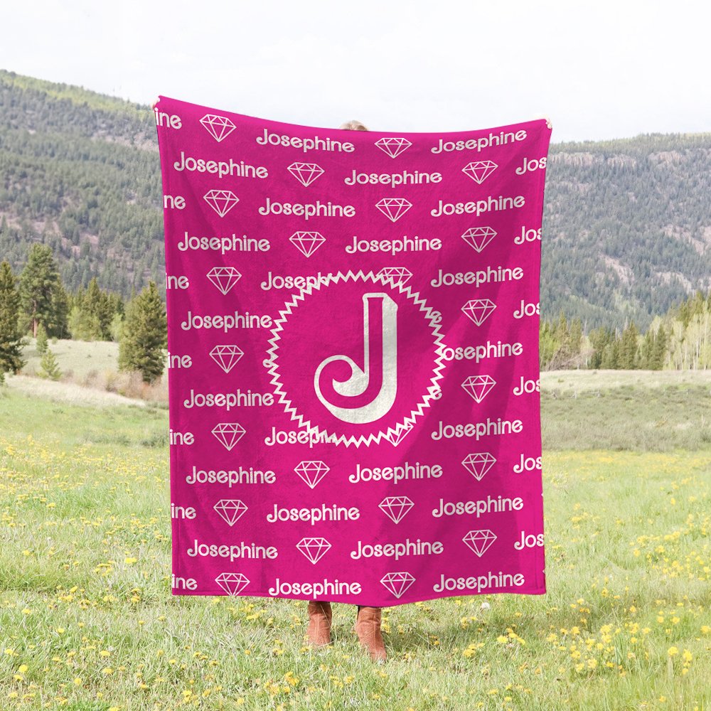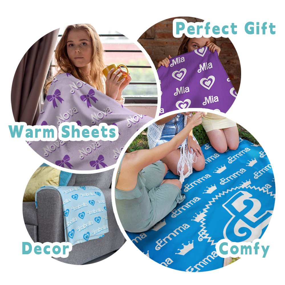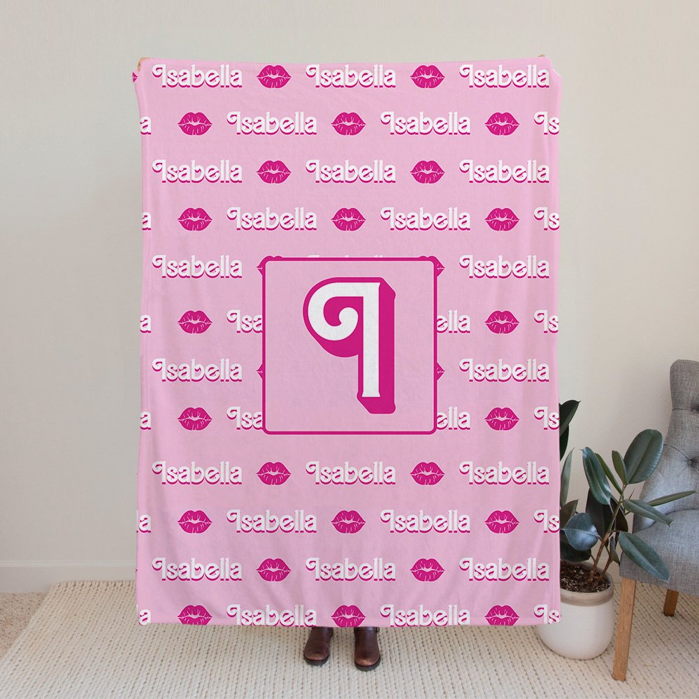 This pink doll style blanket features special style, blanket is available in your choice of five sizes and is perfect for sleeping, sitting on the sofa watching TV, or in the winter, It can also be customized with your name and the pattern you want. Personalize a unique blanket with your own personal style.