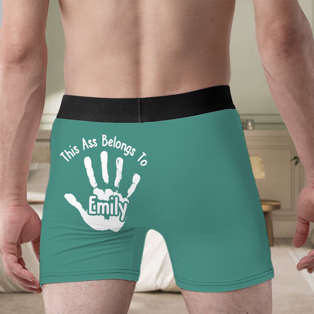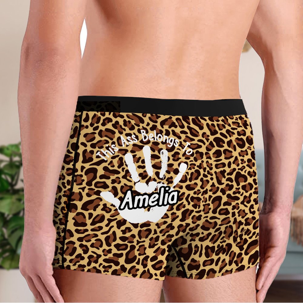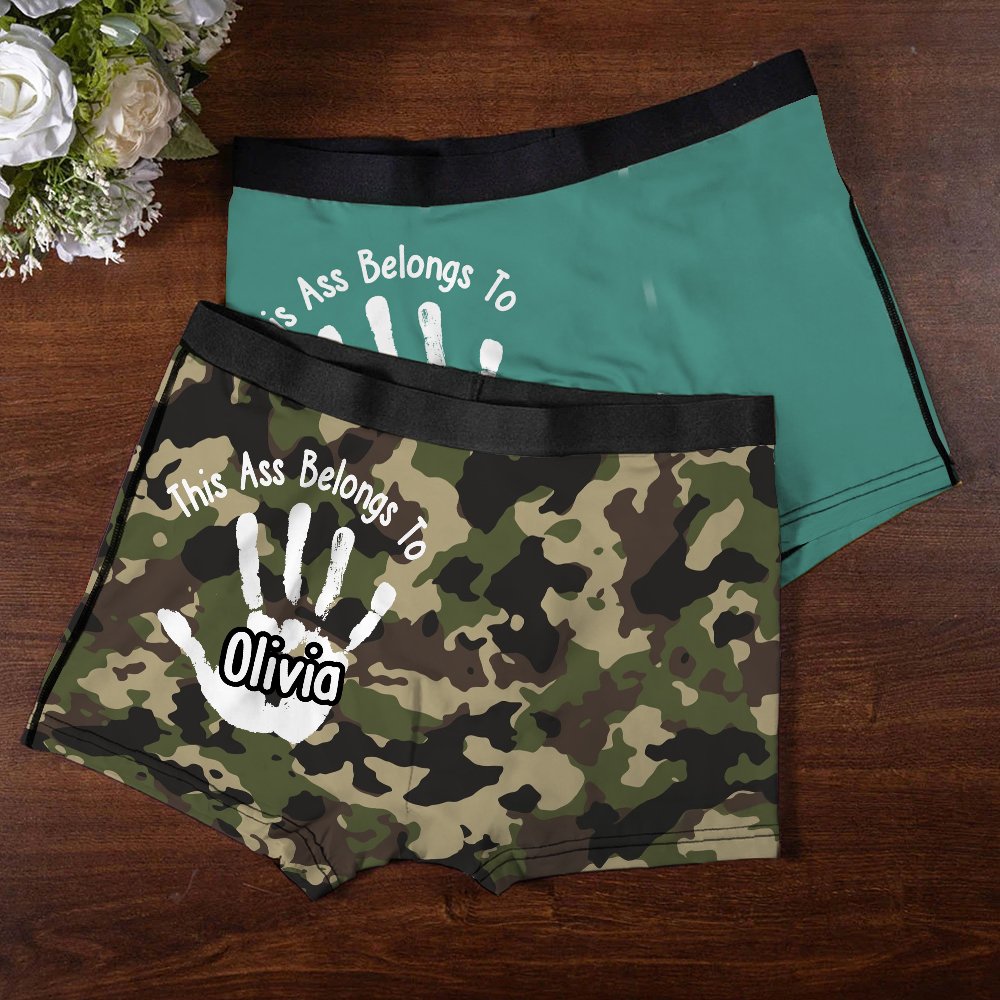 These men's briefs feature a fun, intimate theme with "This Ass Belongs To" and a palm print with a customized name. The bold and humorous design turns the briefs into a declaration of love as if they were being gently “stamped” by your lover, humorously expressing your possessiveness.